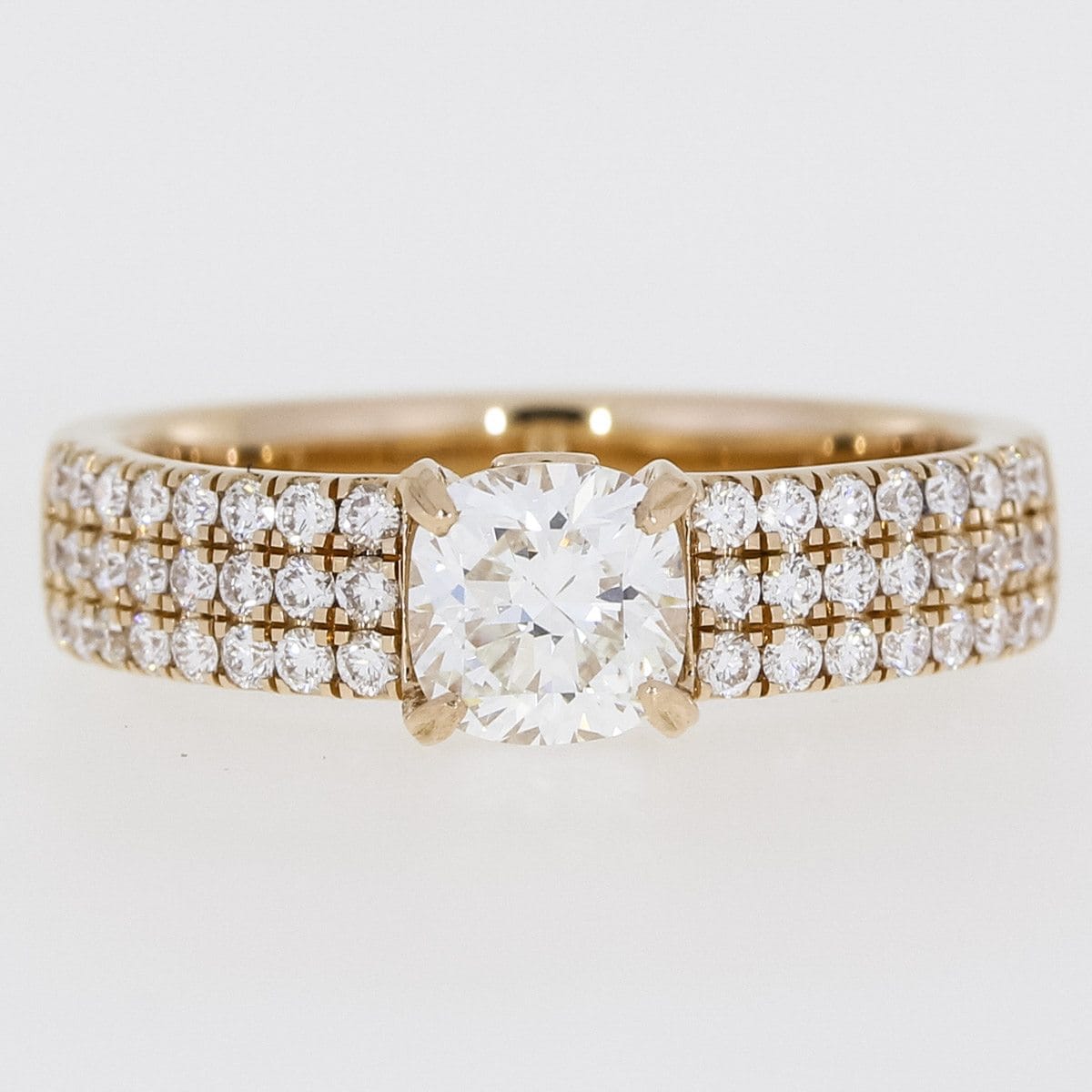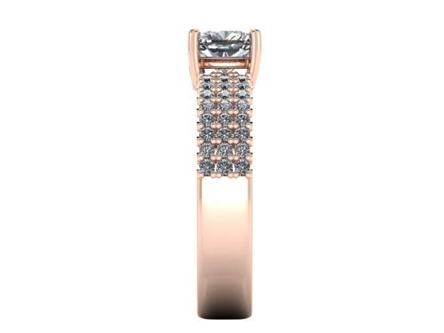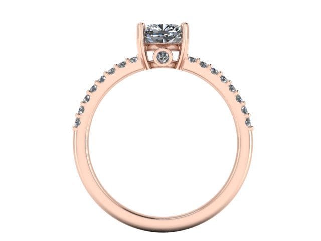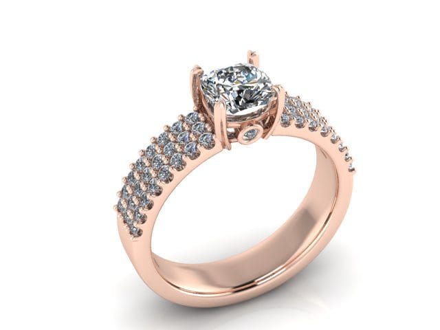 This rose gold ring incorporates a modified custom pave/French set wide band of diamonds in order to create a bold and contemporary background for this incredible cushion cut diamond centre stone. The centre diamond is claw set allowing for its prominence to be noted without overpowering the overall ring design.This open setting has allowed a hidden peak stone to nestle under the main diamond.