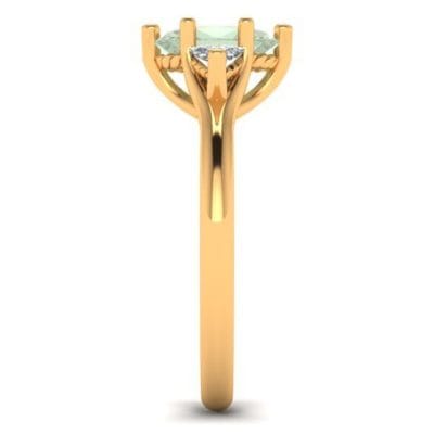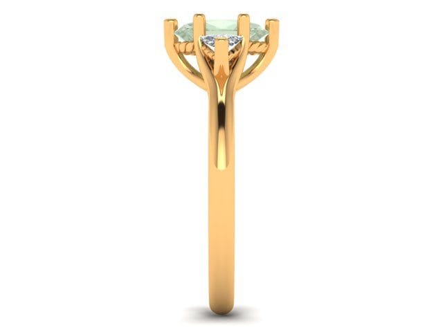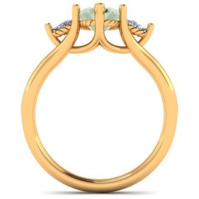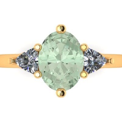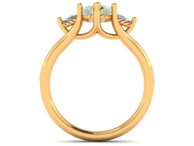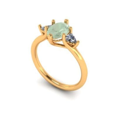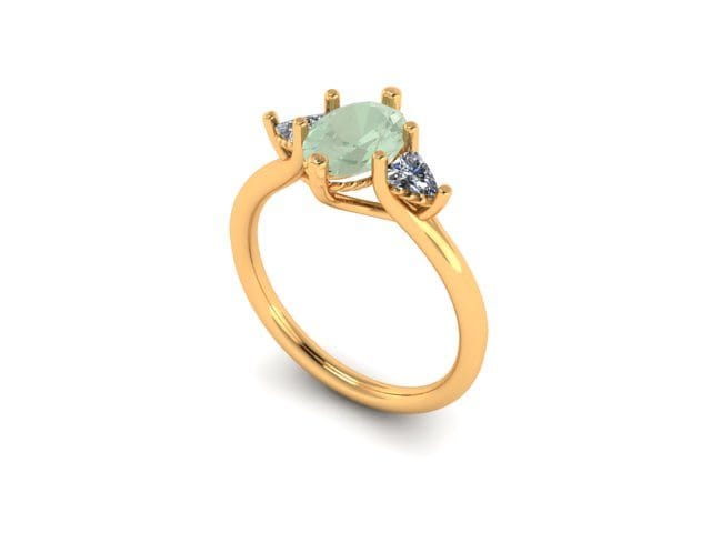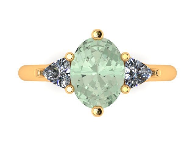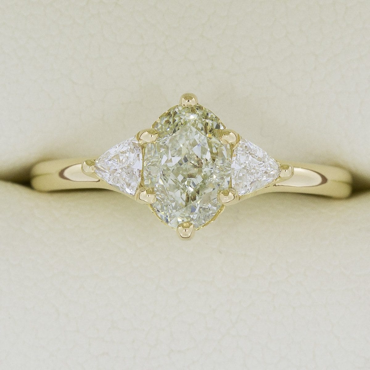 This meticulously designed and perfectly crafted engagement ring is the product of consultations with our client who wished for a subtle yet elegant three stone engagement ring. The yellow gold band provides a basis for the fancy green oval cut diamond and trillion cut accent diamonds to be presented. The trellis style gallery allows for the stones to be displayed showing their full beauty.