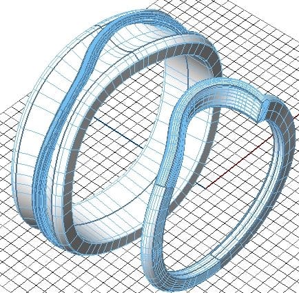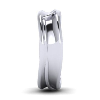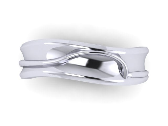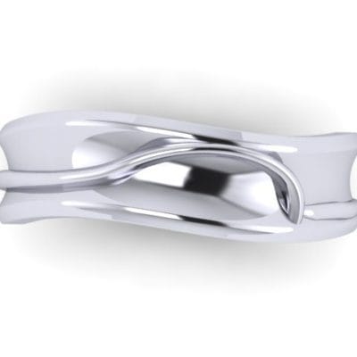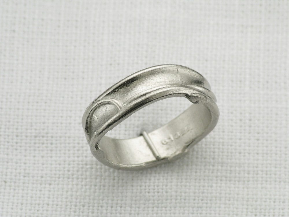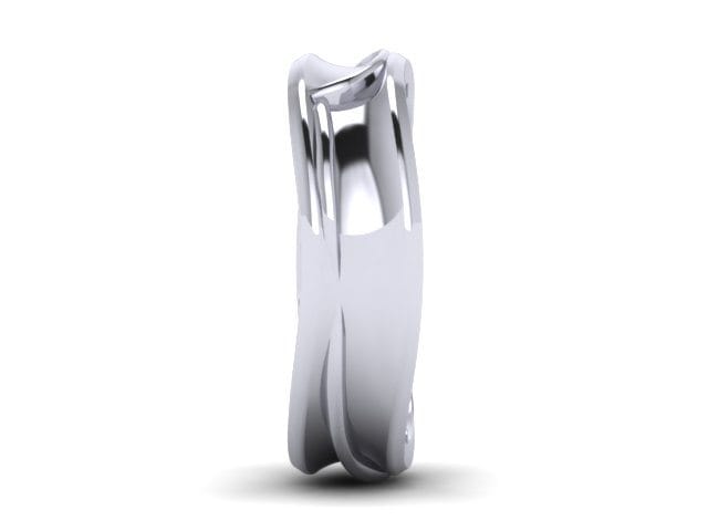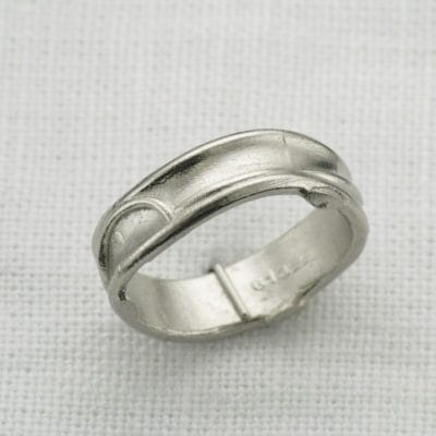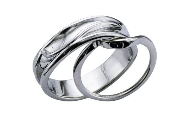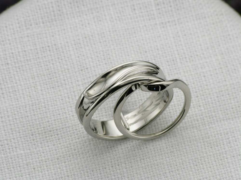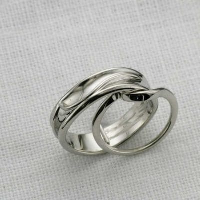 This was a really fun project for us to do. We had already made the bespoke engagement ring for this couple and they came back to Hot Pink for their wedding bands. The ladies was a bespoke contour band to follow her engagement ring and our client wanted his band to feature the same design in some way but wanted the piece to be completely asymmetrical and male appropriate. We very quickly came up with the idea to embed the female band on top of the gents wedding band to create this beautiful organic form. From every angle we guarantee there isn't one straight line in sight! Both of these rings are made from palladium.
