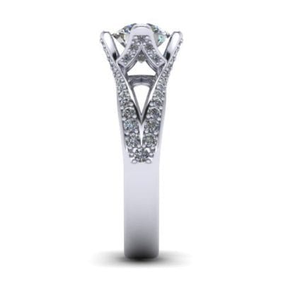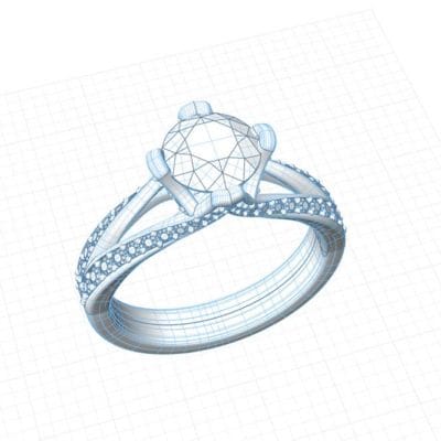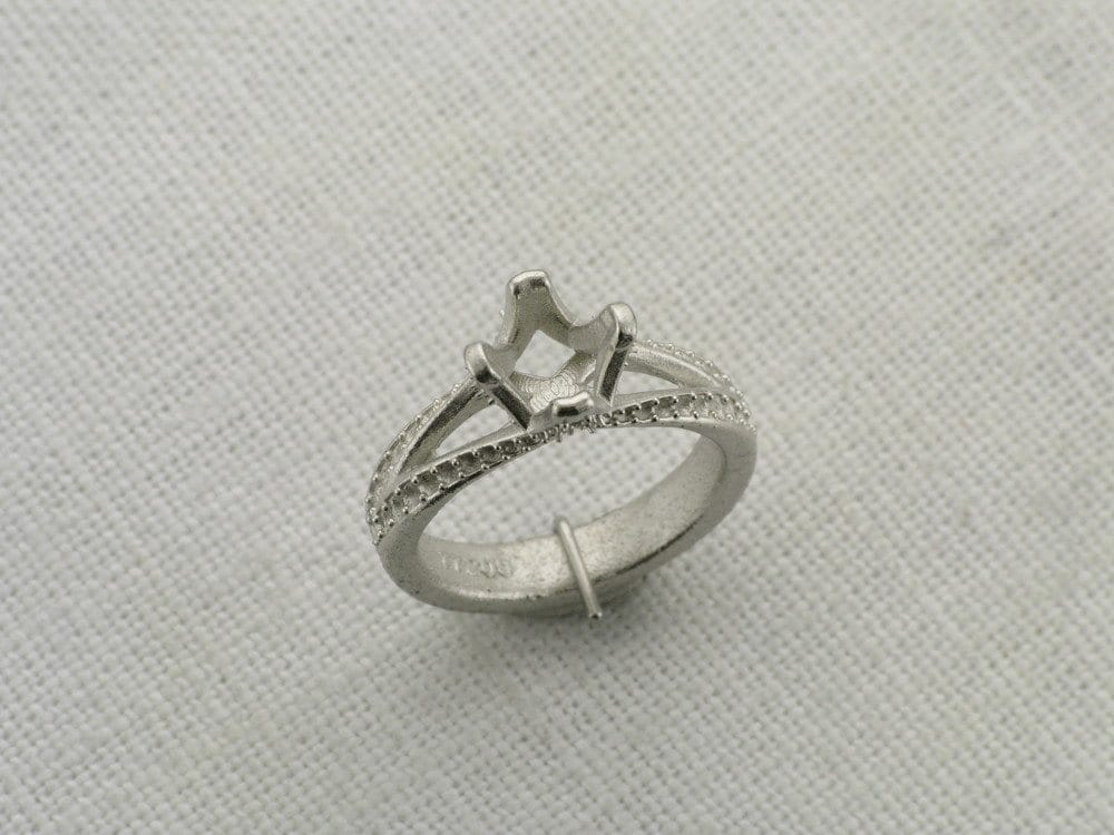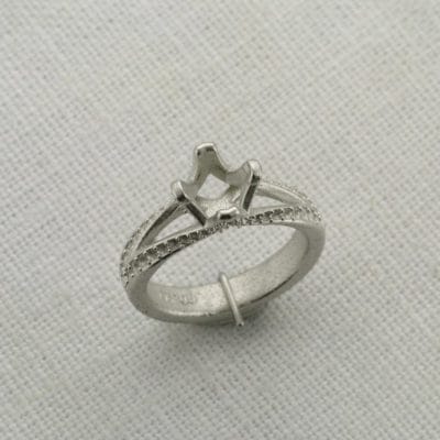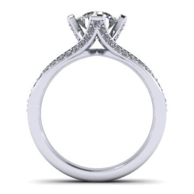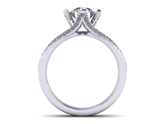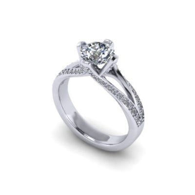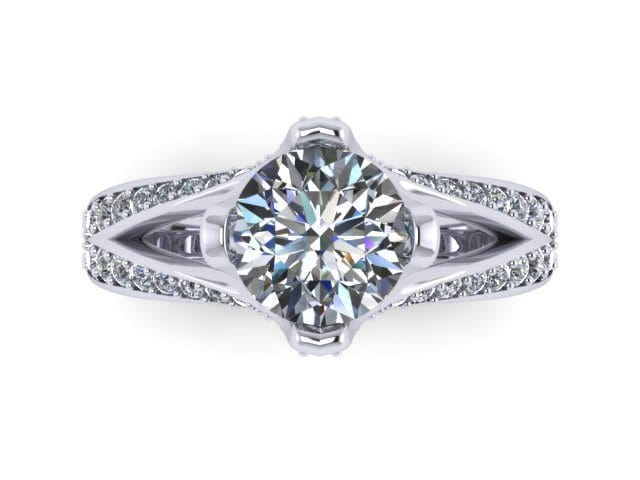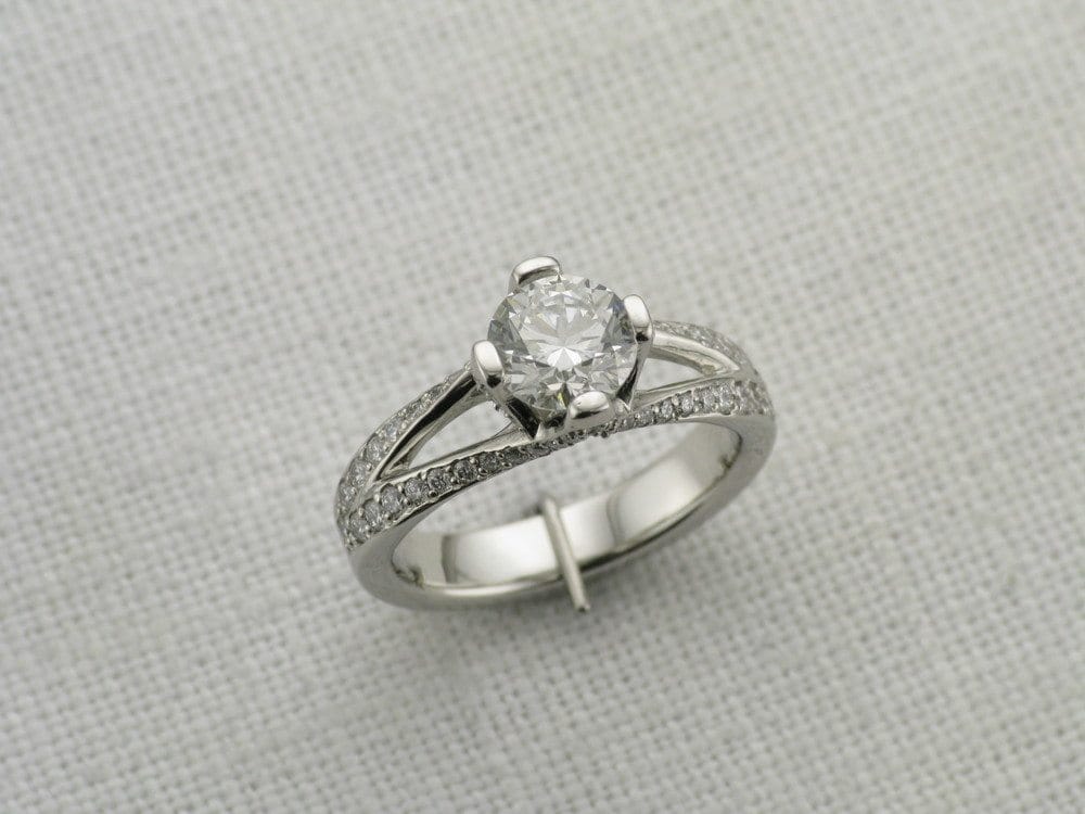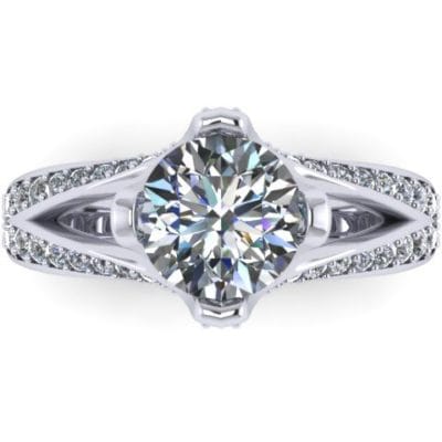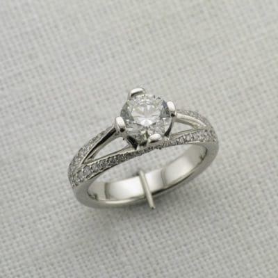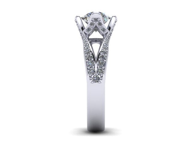 This intricately designed ring was made using lost wax casting which is perfect for designs such as this. The four claws are set North, South, East and West which is quite unusual but works perfectly to emphasise the beautiful round diamond and pave set split shank. This ring is made in platinum with the diamond set shoulders flowing up towards the centre stone creating fluidity throughout this piece