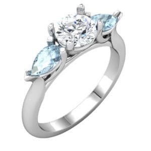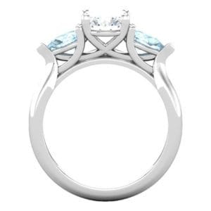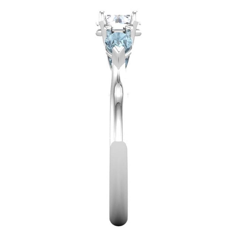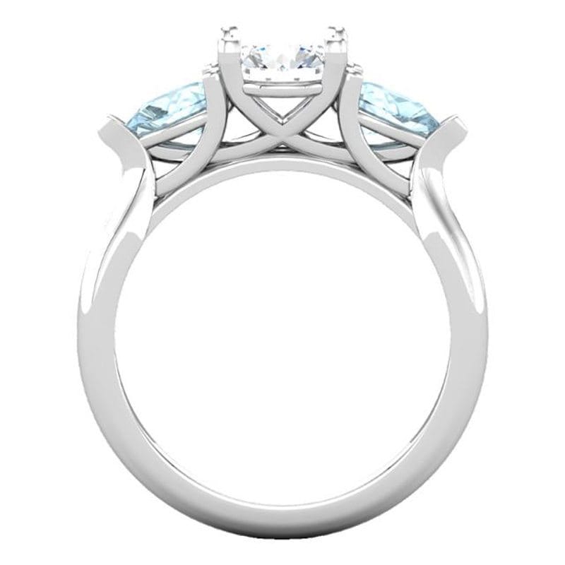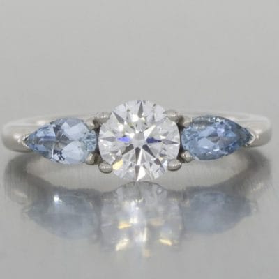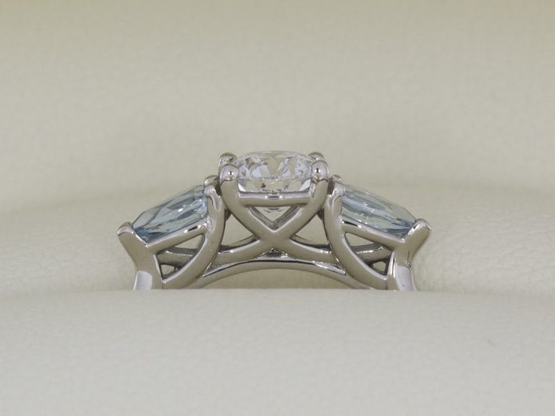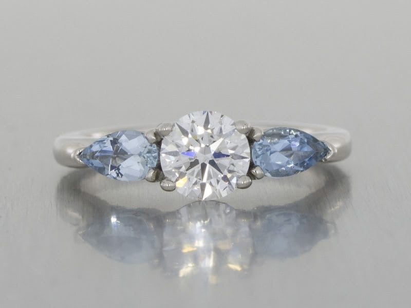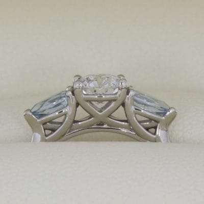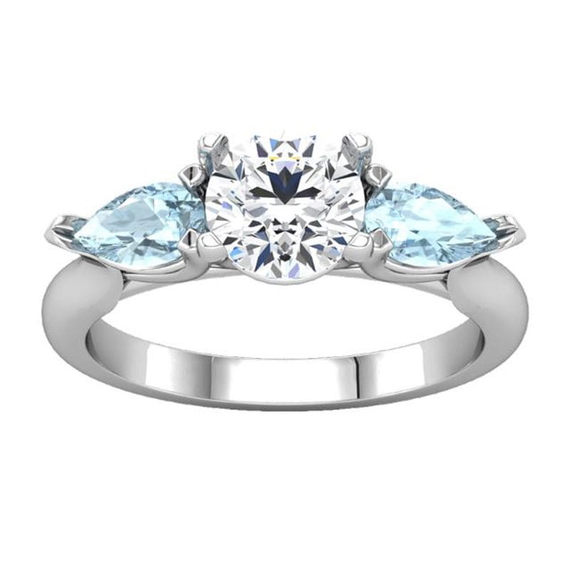 This palladium ring features beautiful pear cut aquamarines alongside a brilliant round lab grown modern diamond to create a stunning three stone engagement ring. The palladium ring shank has a cathedral style, allowing it to act as the final setting for the tips of the aquamarine pears, creating a seamless transition from the ring to the stones.
