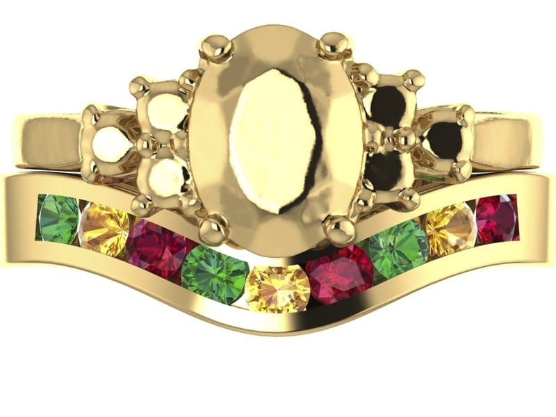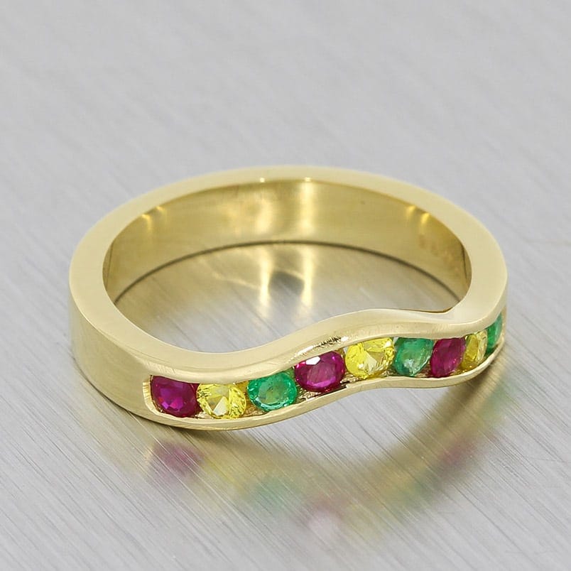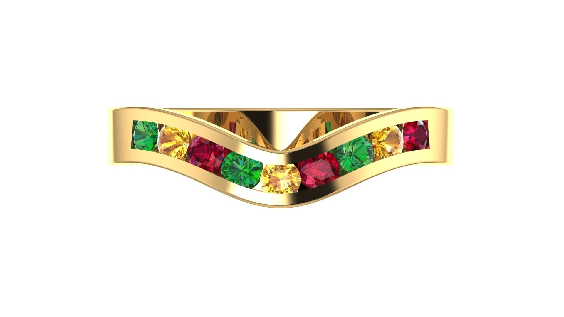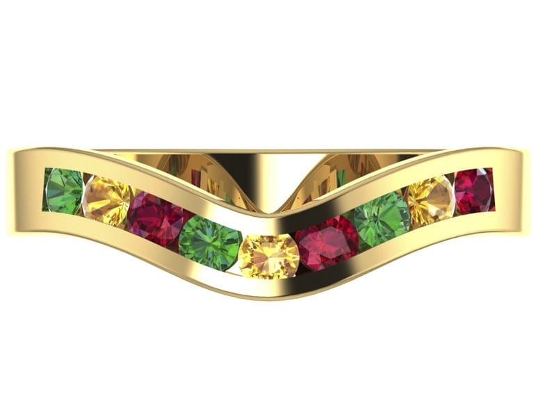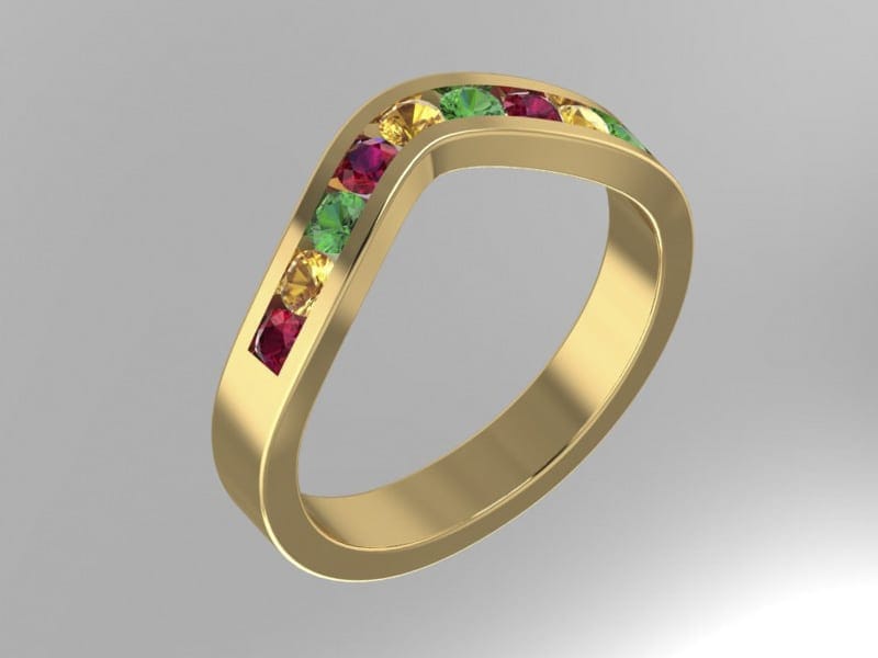 A distinct 18k yellow gold wedding band, contoured perfectly to fit around the clients existing engagement ring. The ring features a gorgeous mix of emeralds, rubies and yellow sapphires, all round cut and channel set with backholing to allow for light to enter the stones and show the colours off as best as possible.