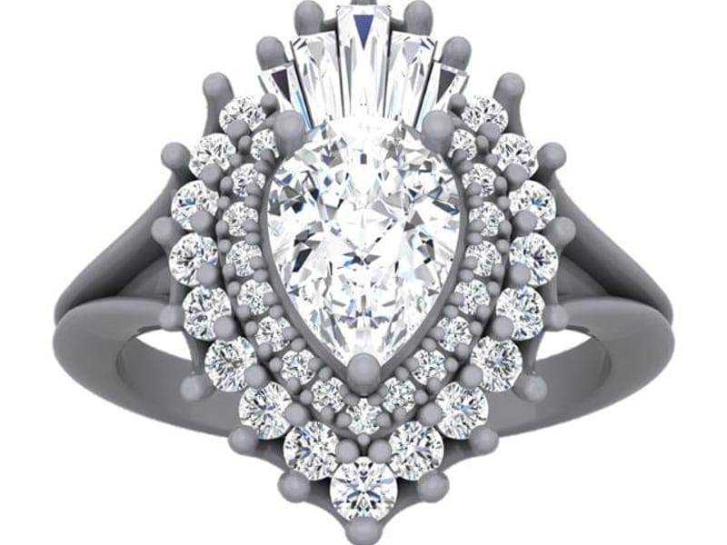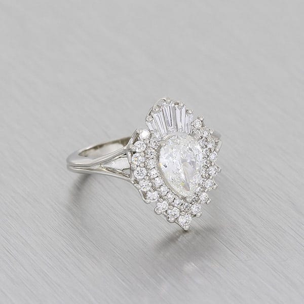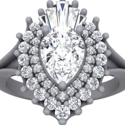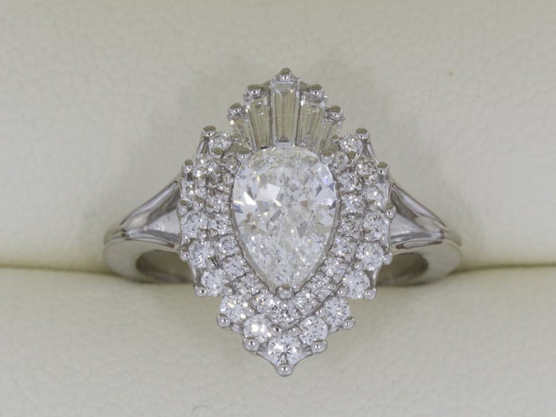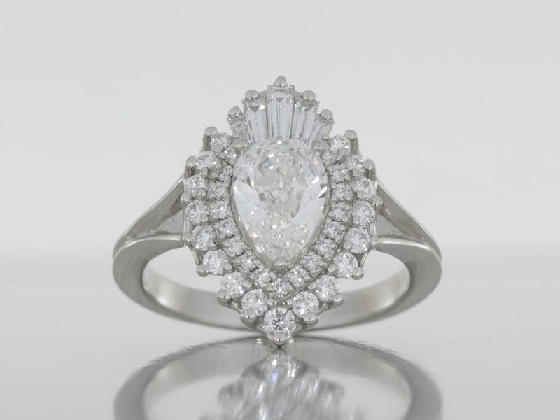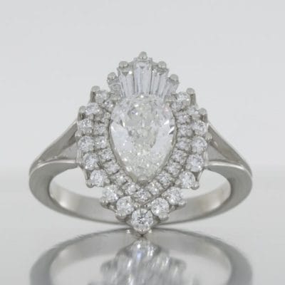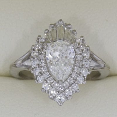 This magnificent pear shaped ballerina ring is created in platinum and accented with round brilliant and baguette cut diamonds. With its beautiful silhouette this design will be sure to attract compliments.