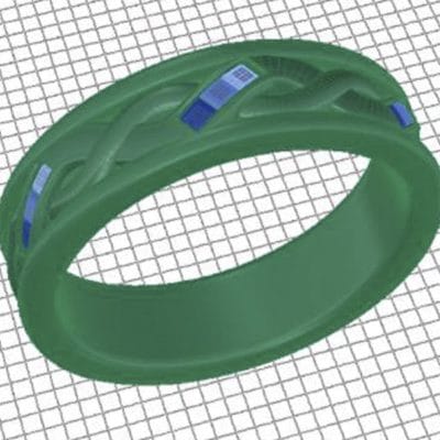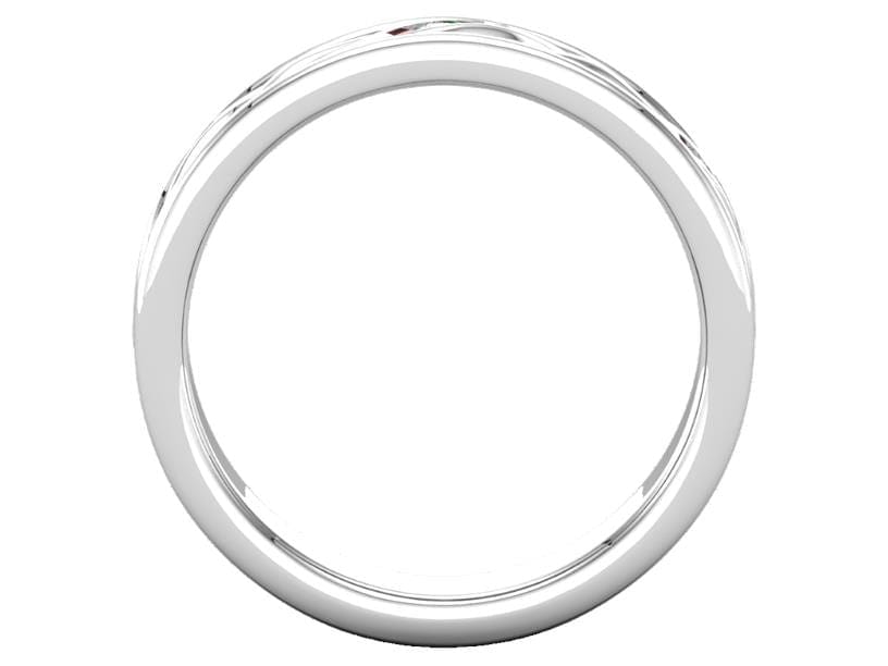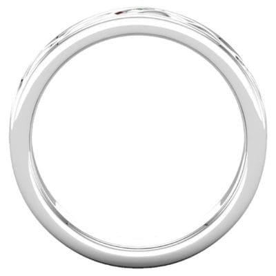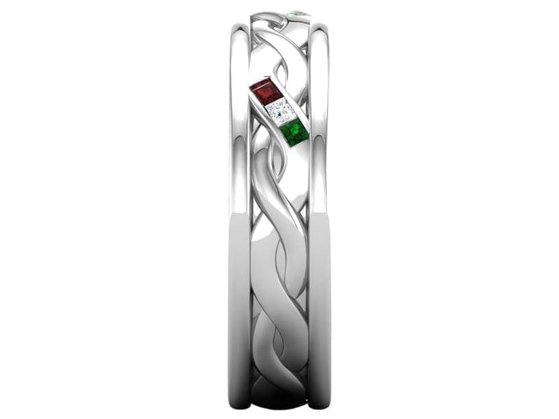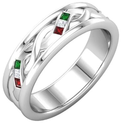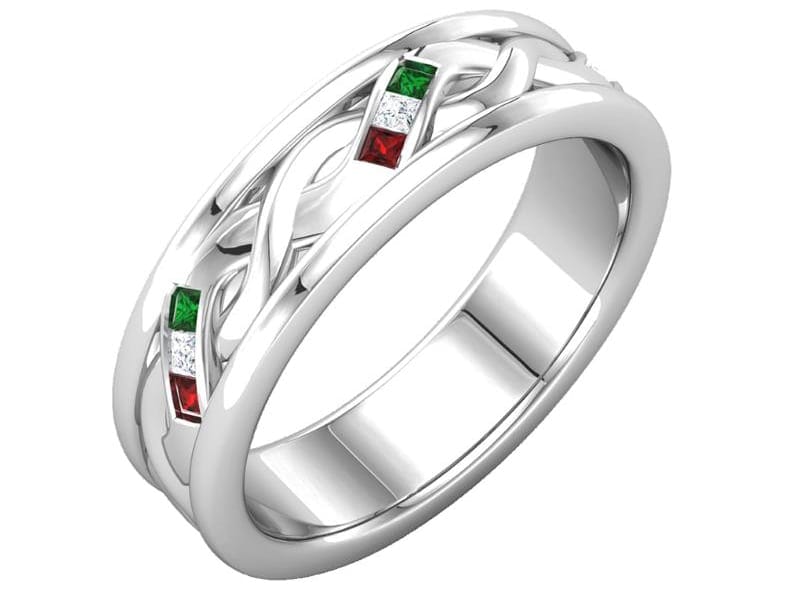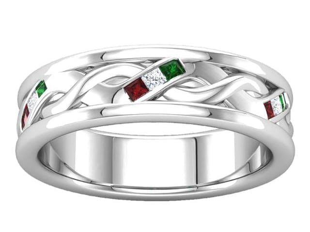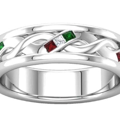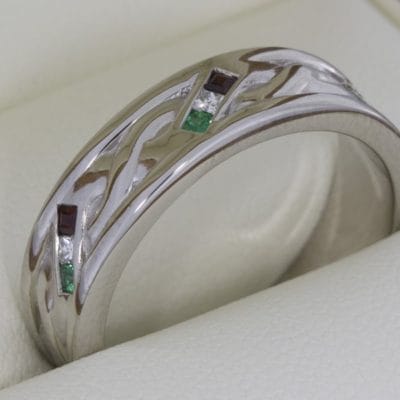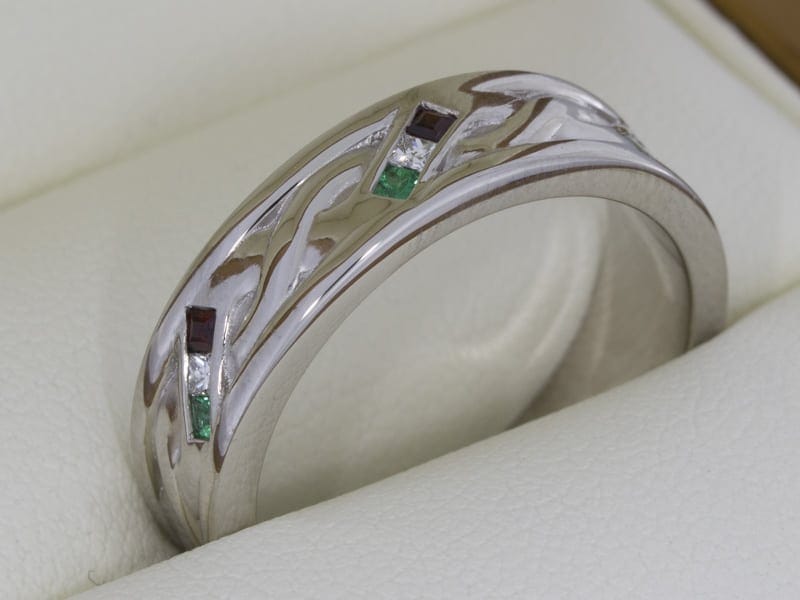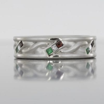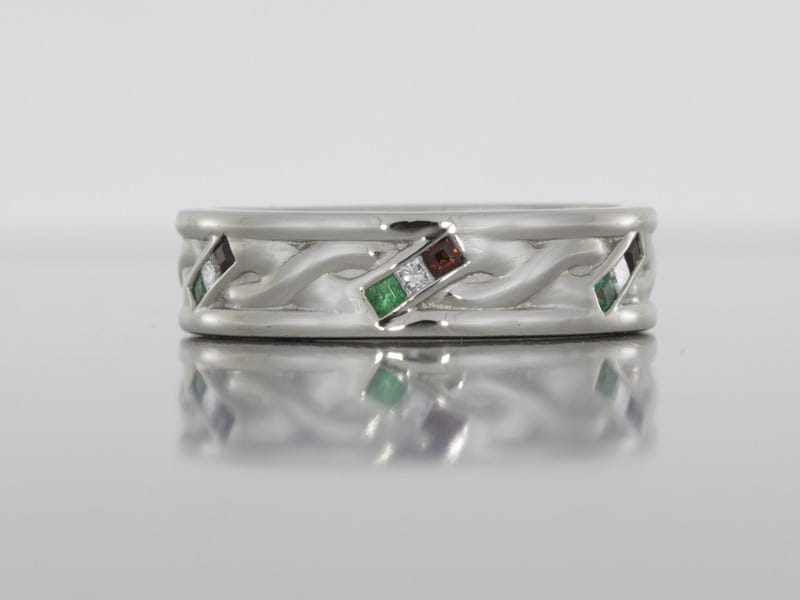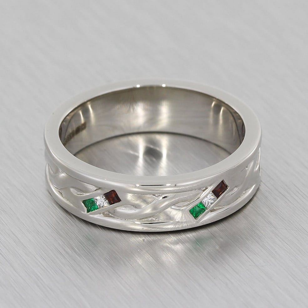 A palladium men's engagement ring featuring two entwined bands with a border on each side. One of the entwined bands is set with square cut emerald, diamond and garnet in a row at three separate points around the ring. Adding the stones shows a touch of personality and sentiment, bringing colour and life to the ring.
