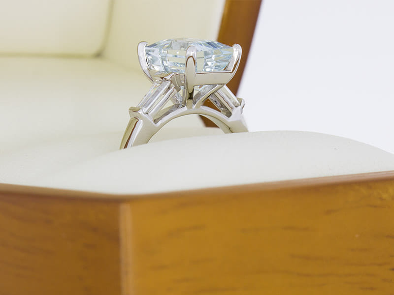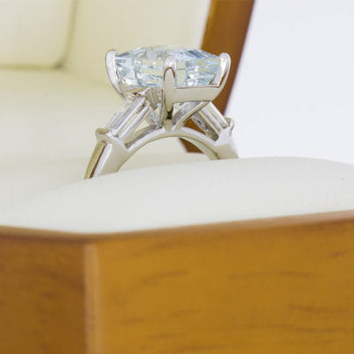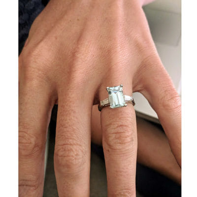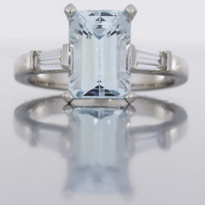 Art Deco style ring set with a jaw dropping emerald cut aquamarine with two tapered baguette stones on either side creating a modern trilogy.