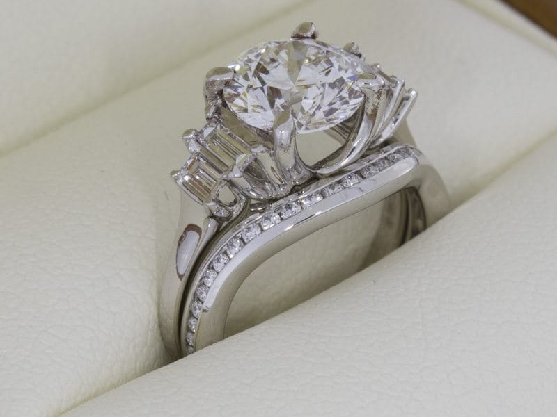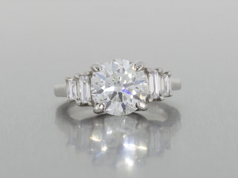 A beautiful example of a five stone ring using baguette diamonds as accents to a stunning round brilliant diamond. Trellis work was used to set the stones, creating a fluid transition from each stone into the ring shank.
