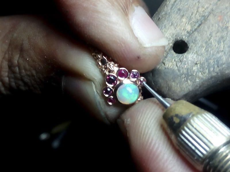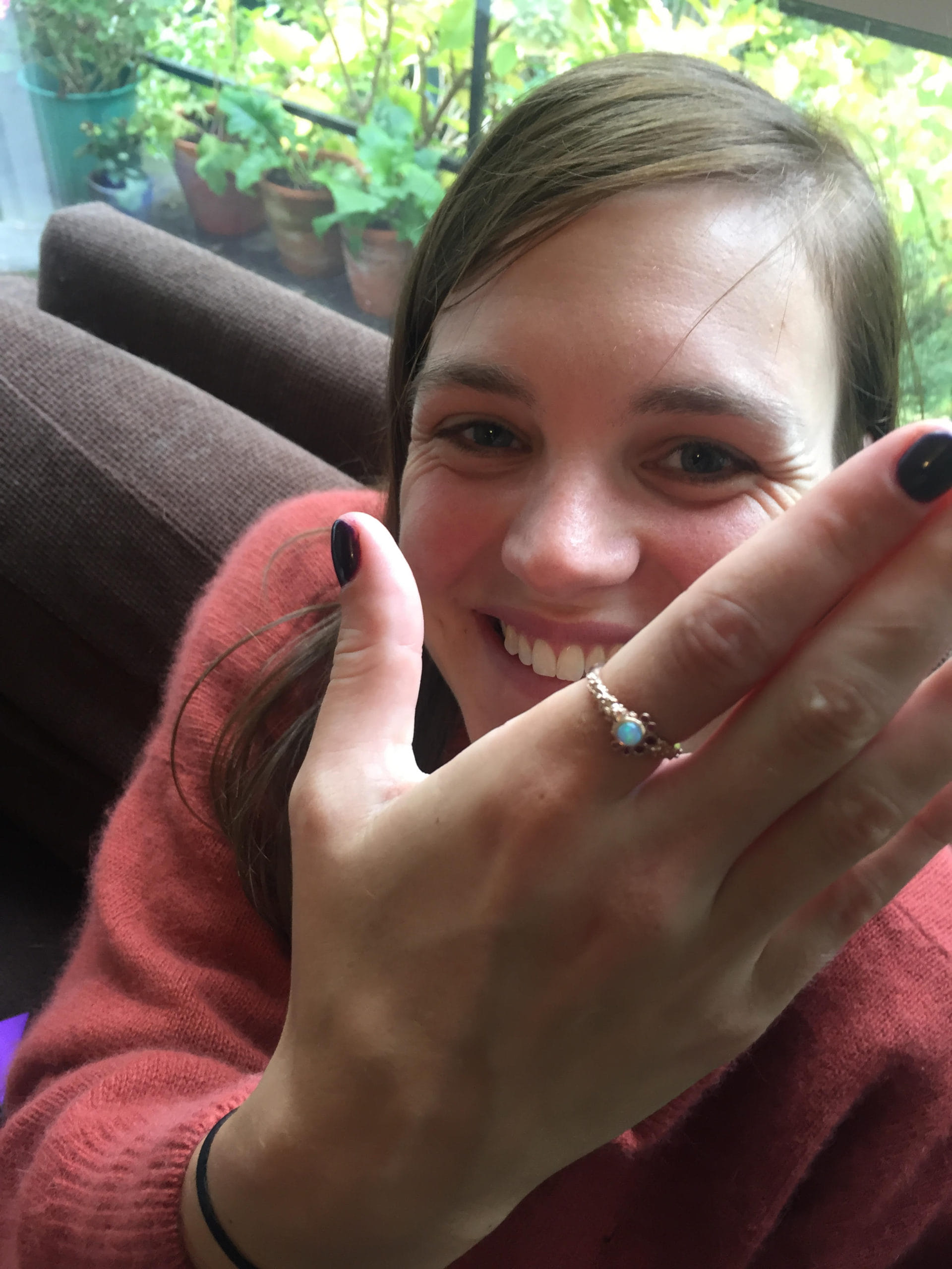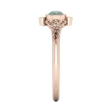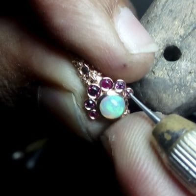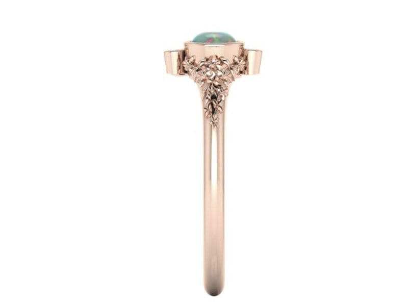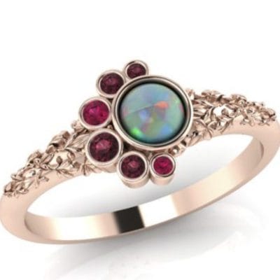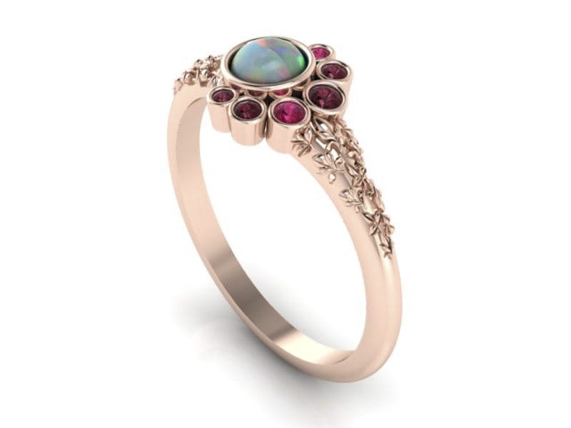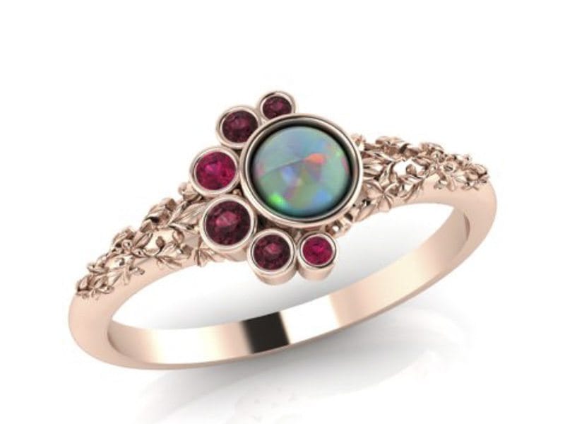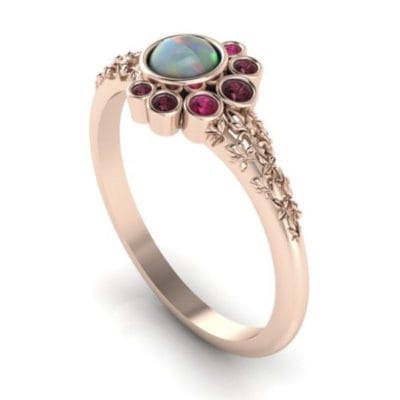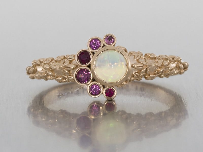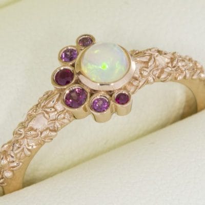 This beautiful organic ring was designed to symbolise an addition to a growing family. Birthstones were scattered around the central Australian opal in a balanced asymmetry. All of the stones were bezel-set with sculpted leaves in 14kt rose gold.