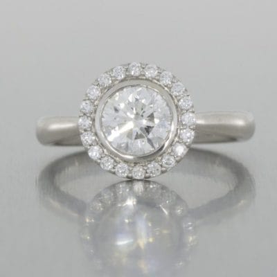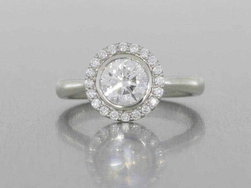 This beautiful contemporary take on a diamond halo engagement ring features a bezel set large centre diamond, adding a slightly modern flavour to this timeless design. The halo has been minimally surface prong set to really promote the accent diamonds. A cathedral shank has been used, allowing a fluid transition from the ring shank to the central large halo area.