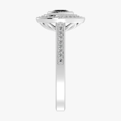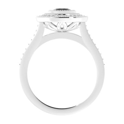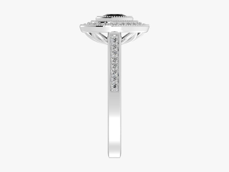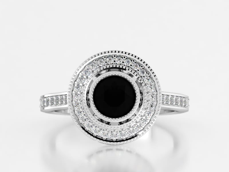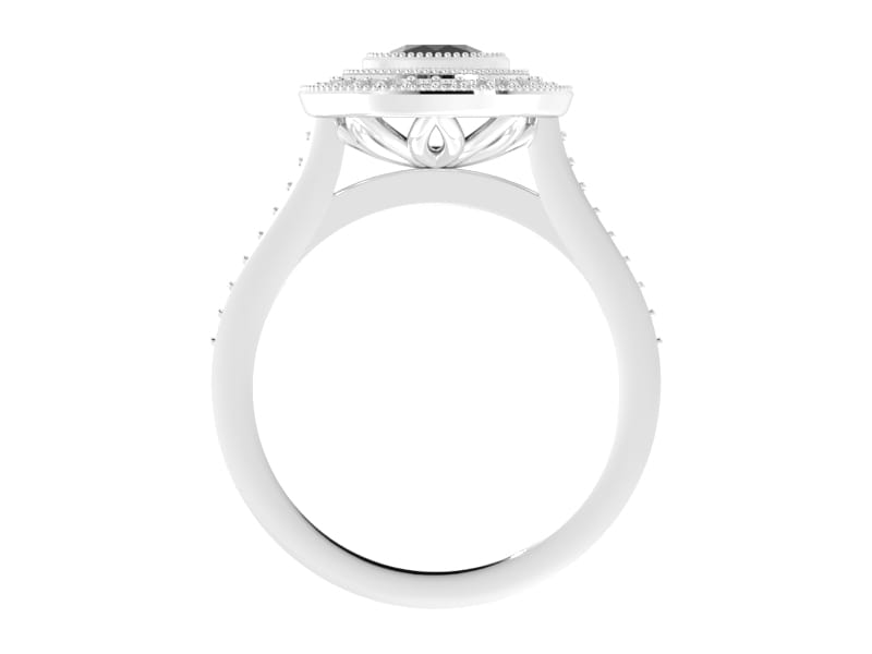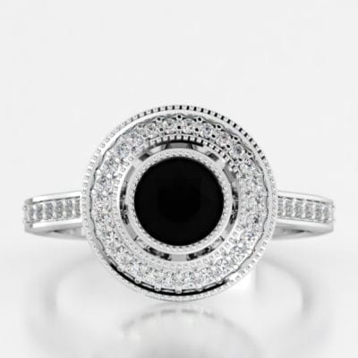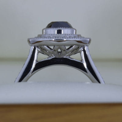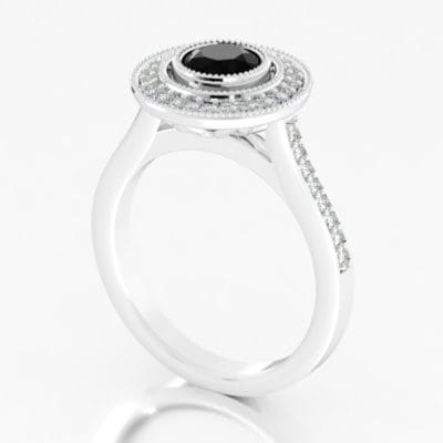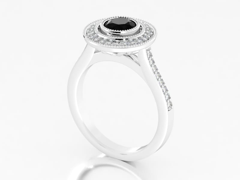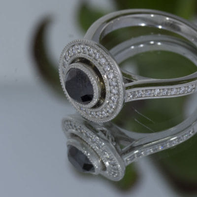 A unique take on a classic halo ring, the client opted for a round black diamond as the centre stone and millgrain detailing for a vintage feel. The ring has been made in platinum and has grain set diamond shoulders and halo.