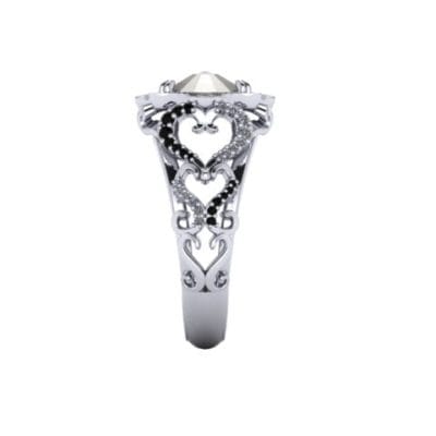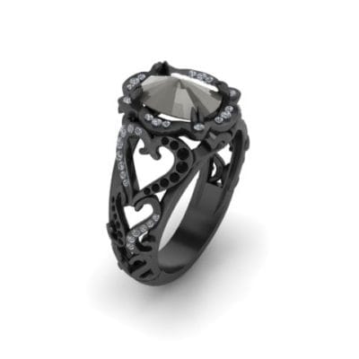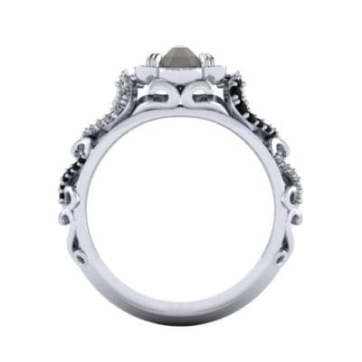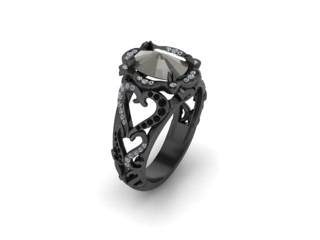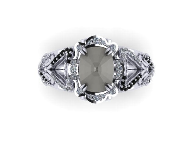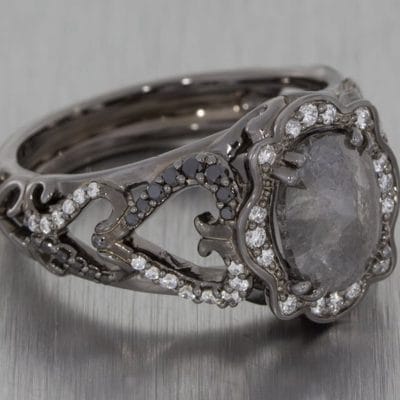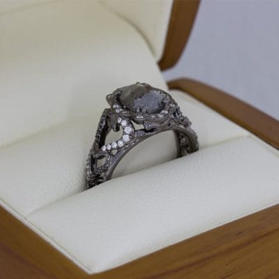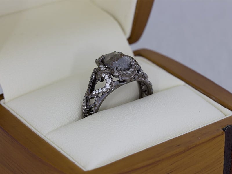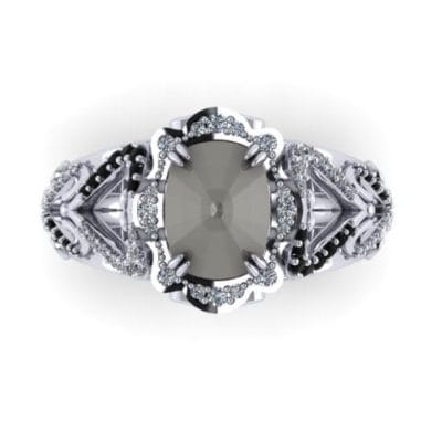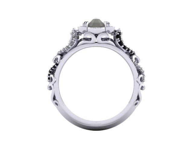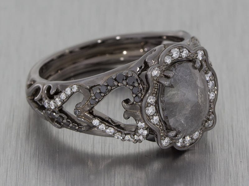 A dramatic and striking ring with a romantic gothic style pattern created in palladium with black rhodium plating to give it the dark look. The scrollwork and halo is set with white and black diamonds, with a unique rose cut grey diamond set in the centre.