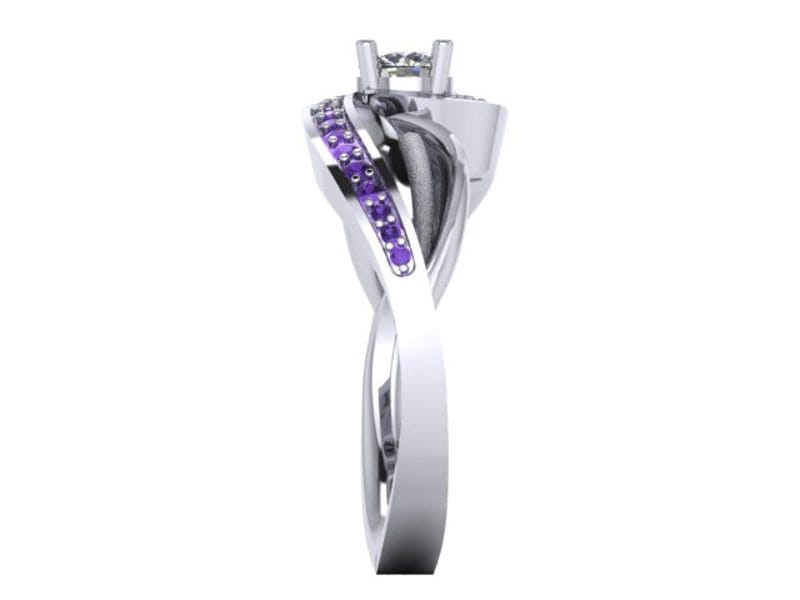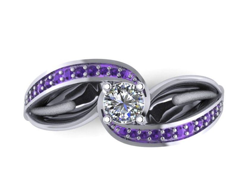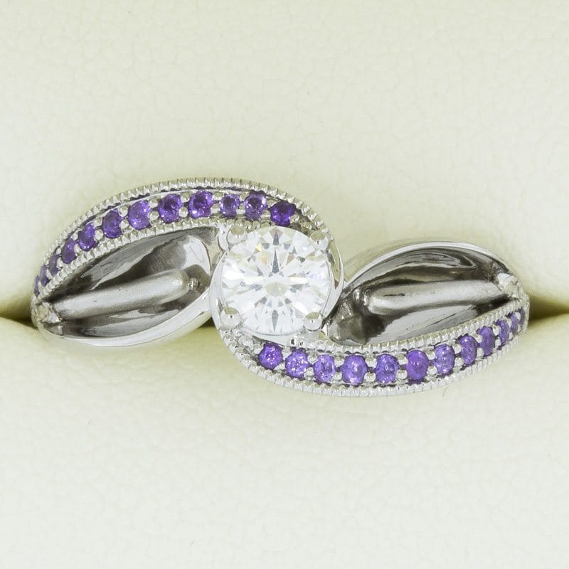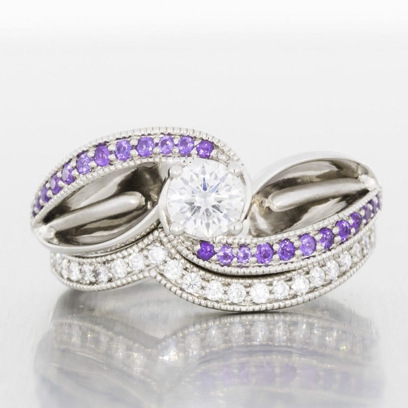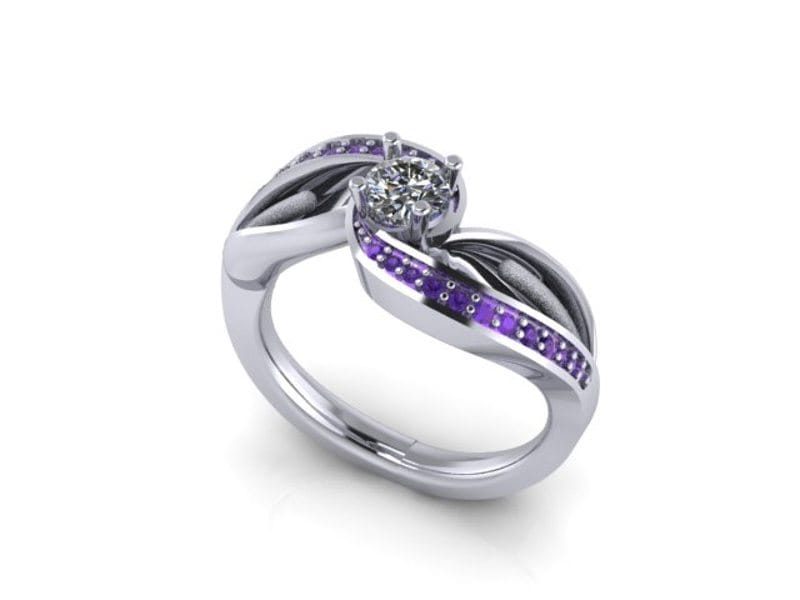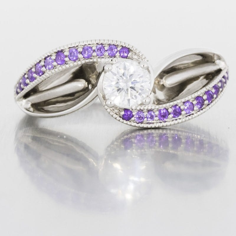 Our 'Ring of the Week' this week is this intricate beautiful diamond and amethyst engagement ring. The rings unique shape was cast in Palladium for its strong yet lightweight properties. The central focal point of the design is the modern, round brilliant cut diamond. Sprinkled across the asymmetrical shoulders are bezel set amethyst accent stones. These give the ring warmth and depth and further showcases the rings individual design elements.
