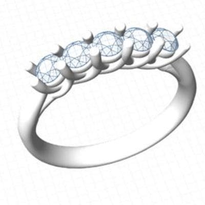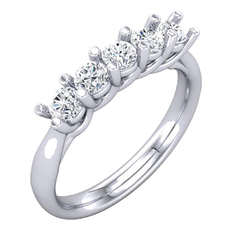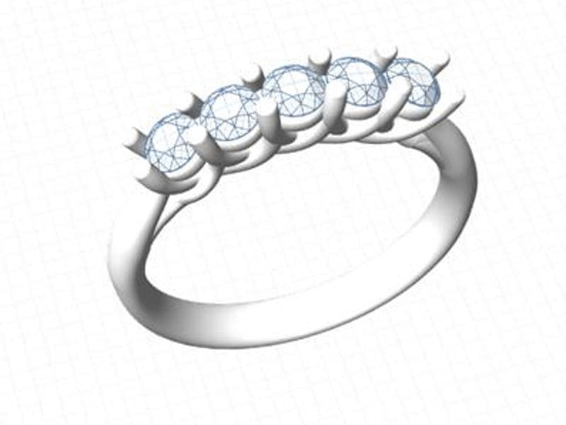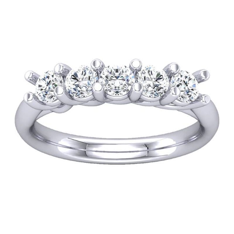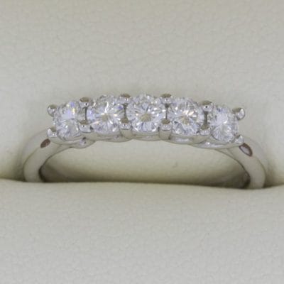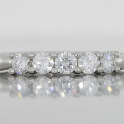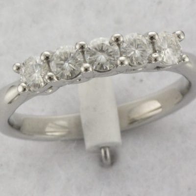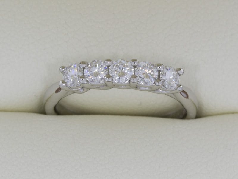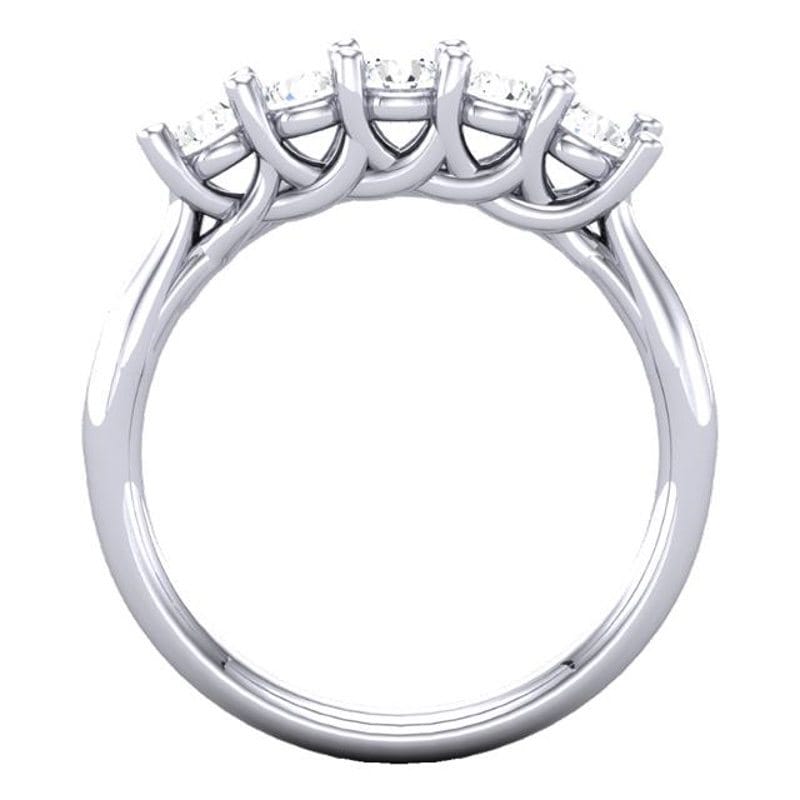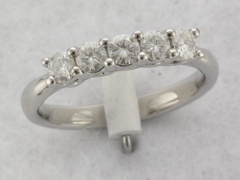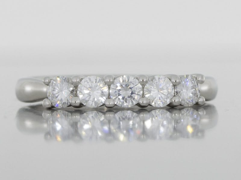 This timeless classic shows a bespoke five stone diamond ring with a pinched platinum cathedral style ring shank.