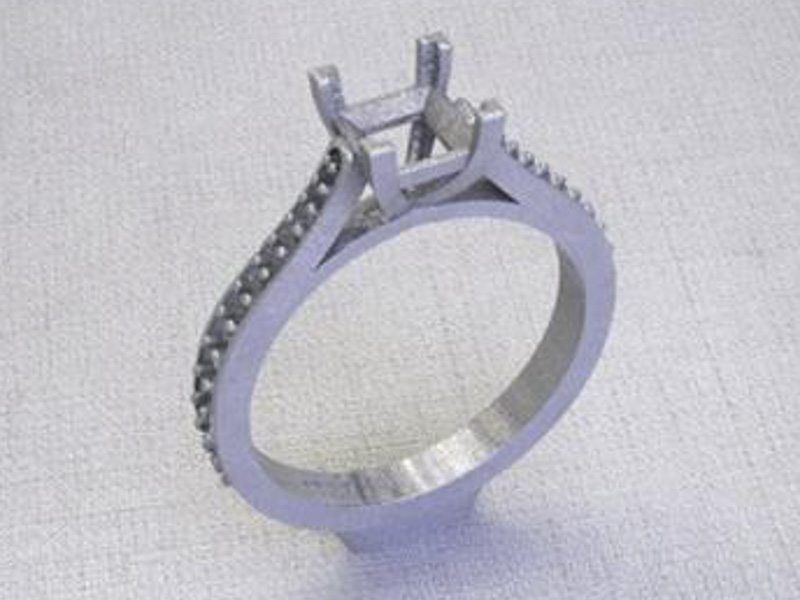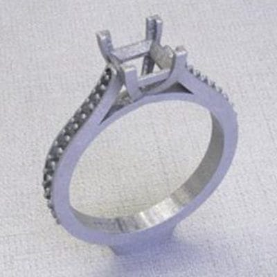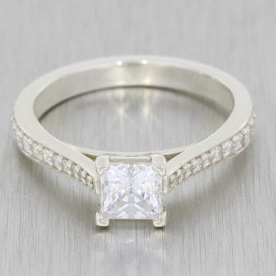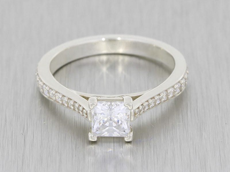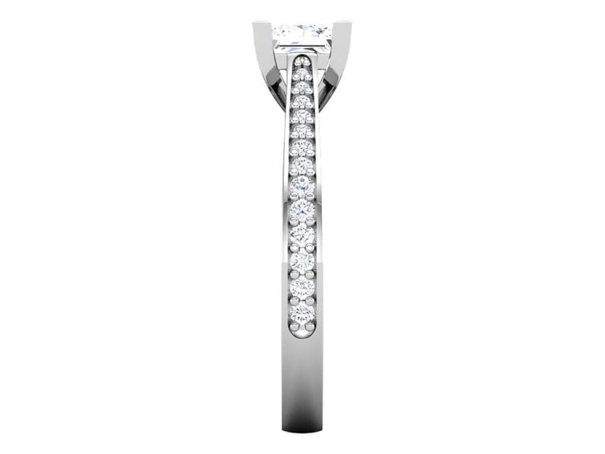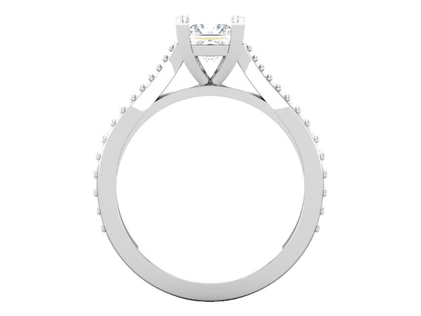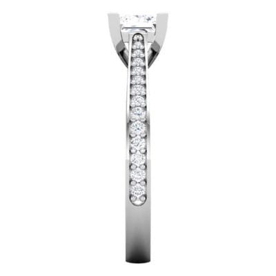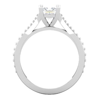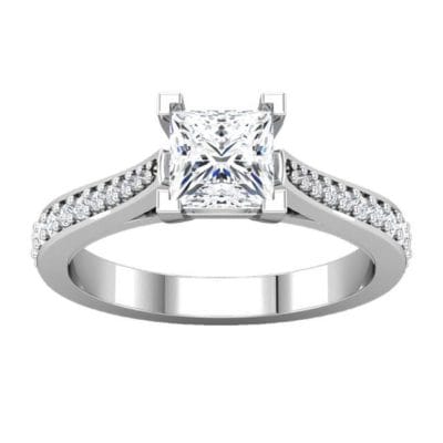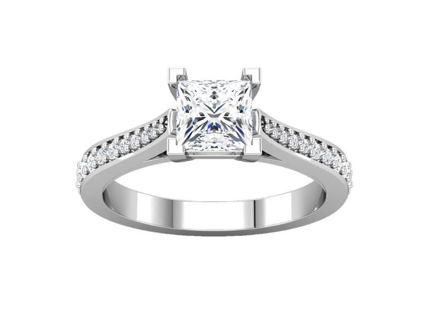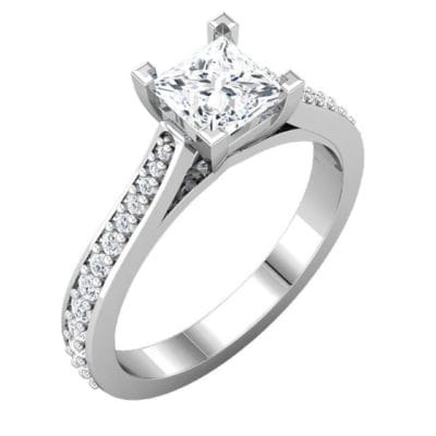 A beautiful princess cut solitaire proposal ring is set with traditional corner prongs with a diamond accent channel set shank. This timeless classic always looks chic, elegant and contemporary.