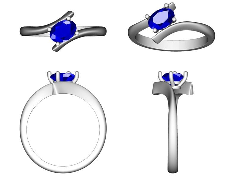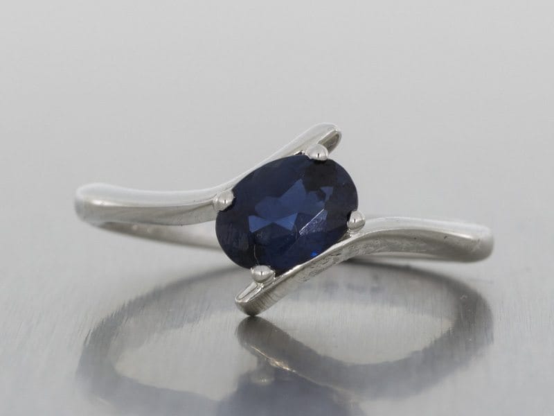 A fluid platinum bypass shank captures an asymmetrically set oval Genuine blue sapphire in this contemporary ring design. This ring has an unusual and effective take on using an oval centre stone.