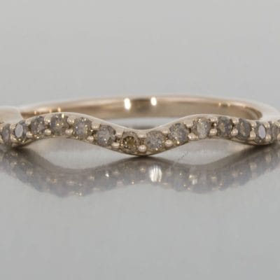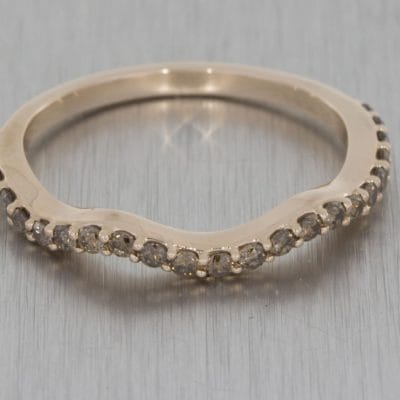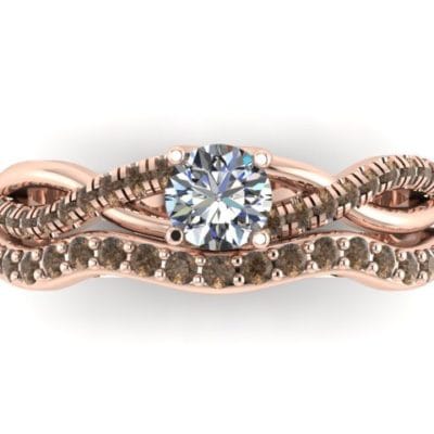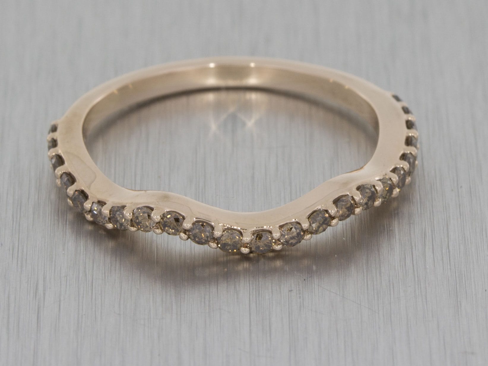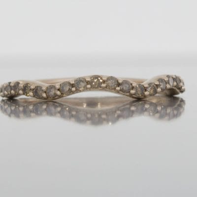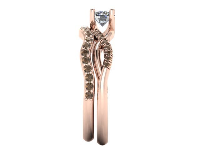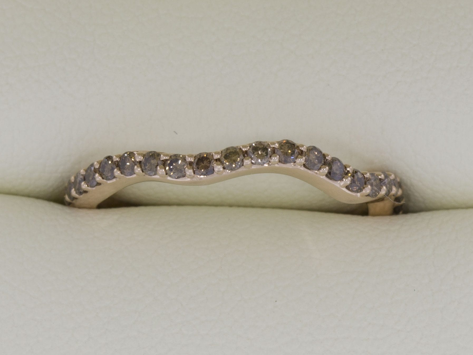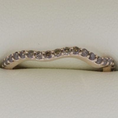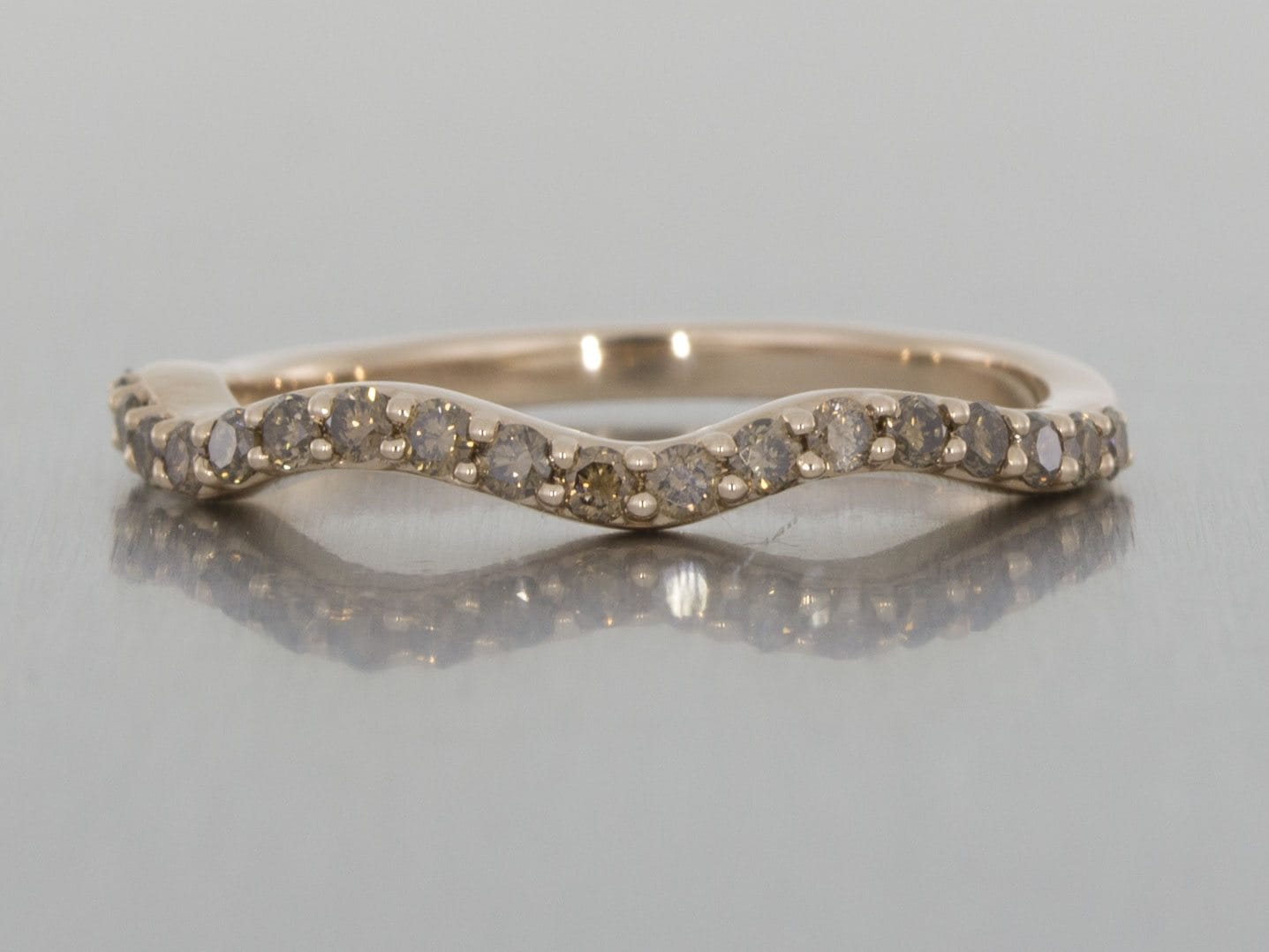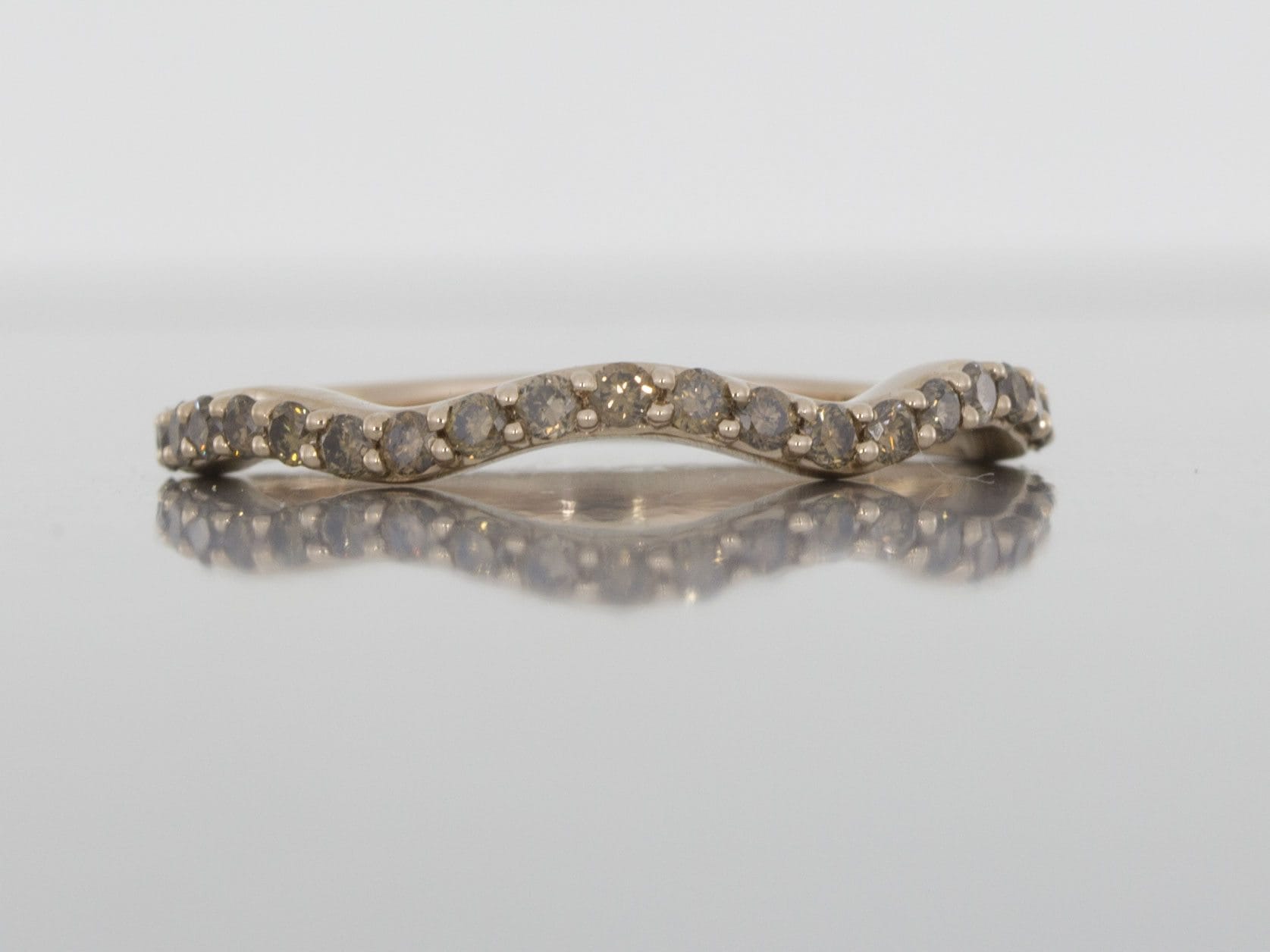 A gorgeous matching wedding band to fit perfectly next to the matching engagement ring. The ring has been beautifully crafted in rose gold and set with cognac diamonds to complete the warm and organic look to this arresting bridal set.