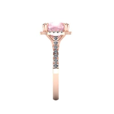 This striking 18k rose gold engagement ring is set with a large cushion cut morganite with a halo of white diamonds, adding sparkle to the soft hues of the peachey pink morganite and rose gold. The centre stone double claw setting nestled in the arms of a cathedral shank. The ring shank and halo both set with white diamonds in a cutdown setting.