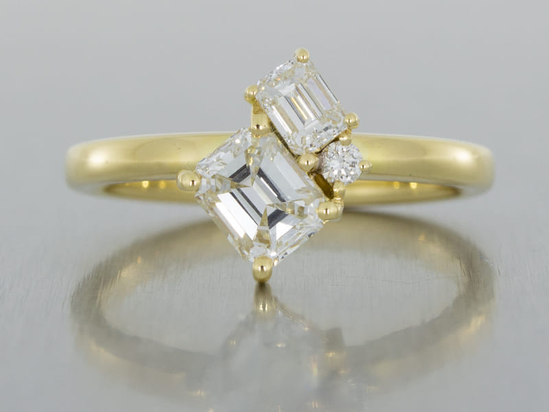 While the round brilliant diamond does deliver the most sparkle, there’s more to diamonds than how they twinkle. So, if you’re looking to make your money go further, check out the other potential stone shapes before you get a fixed design idea in mind. Marquise, oval and pear cut diamonds all bring a slightly different dimension to a ring. They still sparkle, but their charm lies in their larger surface area, which creates the opportunity for more playful designs. They’re also a slightly more cost-effective option. While the emerald cut diamond can be as much as 42% cheaper than round brilliants of the same carat. They’re still utterly beguiling, just in a different way.