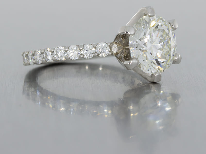 There are various ways that you can add to the detailing of your custom engagement ring to enhance the look of your diamond. We’ve already mentioned pave set stones, but engravings and milgrain detailing can also work, as well as bespoke motifs and metal embellishment. The white metals – palladium, platinum, white gold – usually produce the best results if your primary aim is to increase the appearance of your diamond, but accents of other metals can work well too.