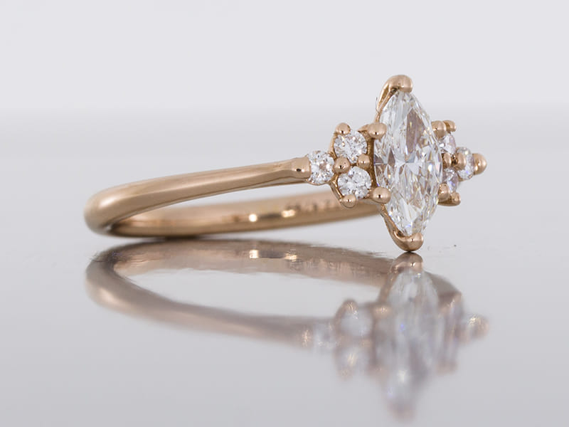 Delicate and delightful engagement ring crafted in 18k rose gold set with a marquise cut diamond sitting vertically along the finger with a trio of small round diamonds on either side.