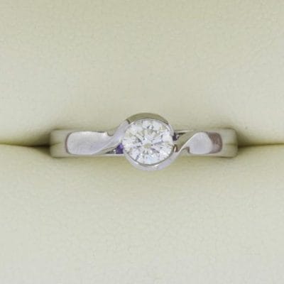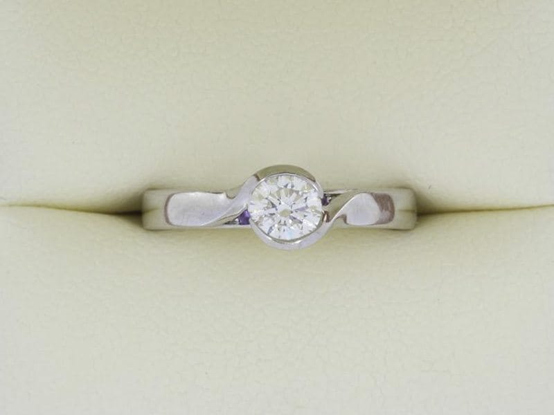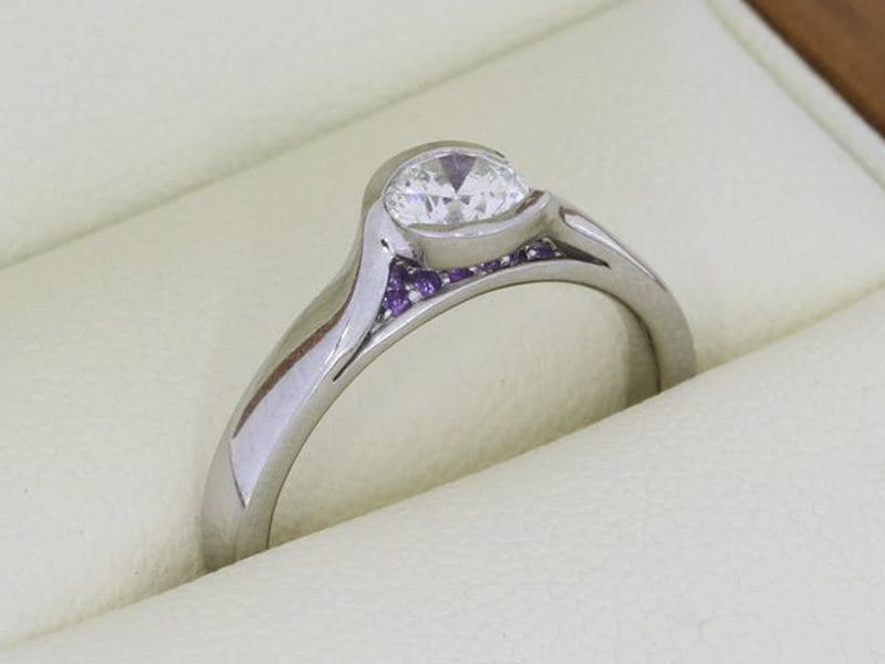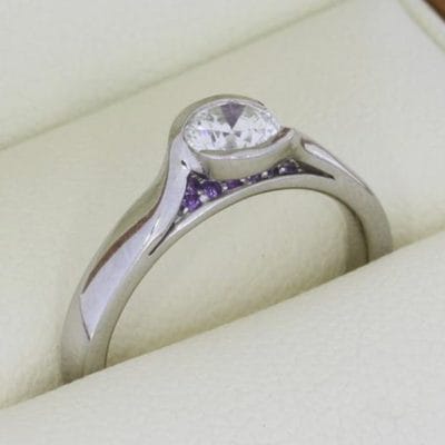 This unique bypass platinum engagement ring features a ‘secret’ pave setting of amethysts underneath the centre diamond. The central stone has been set using a modified bezel setting giving this ring a contemporary style.