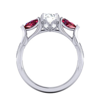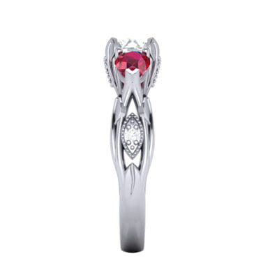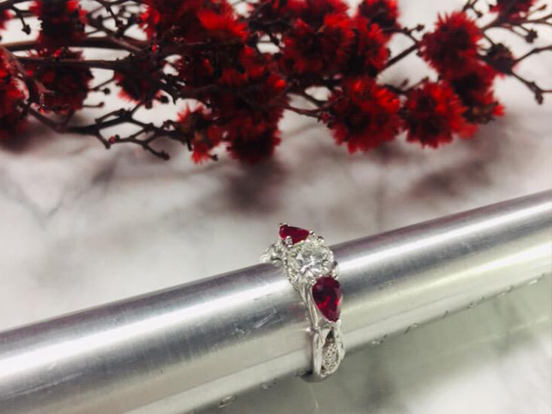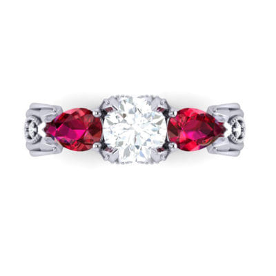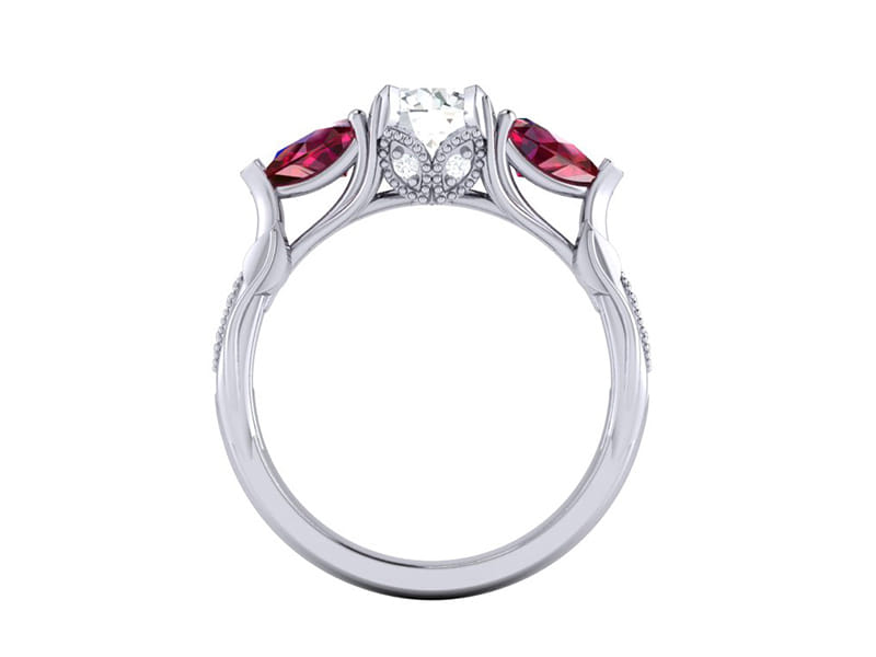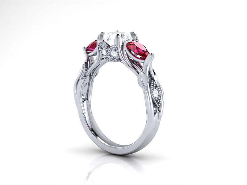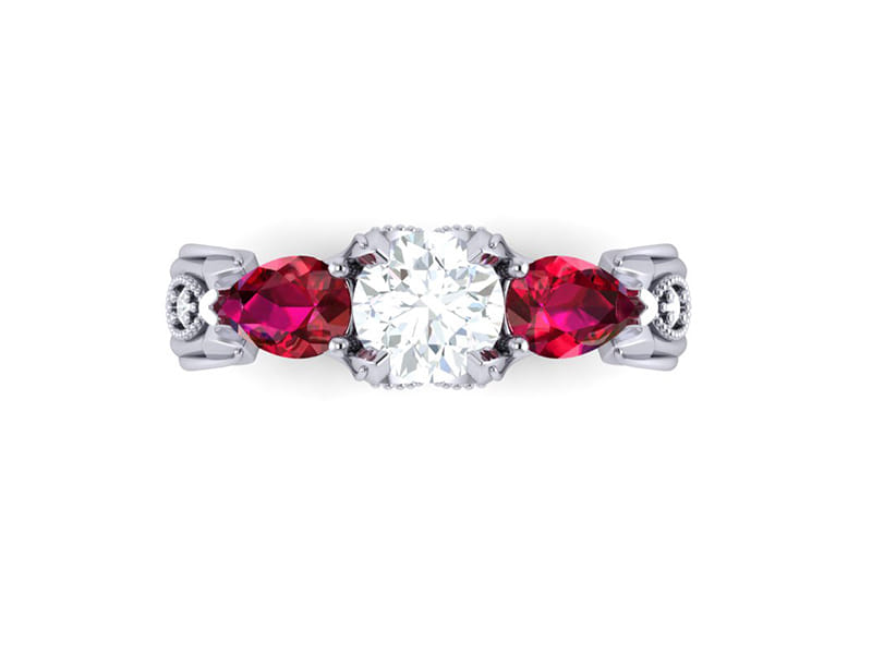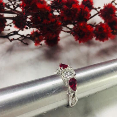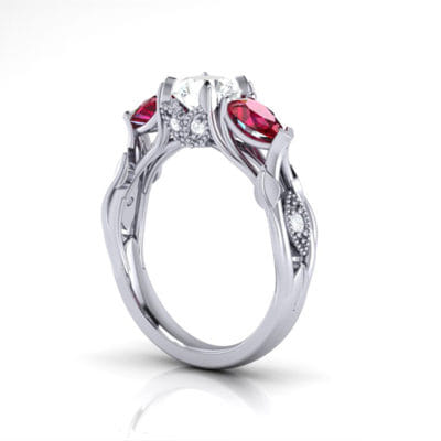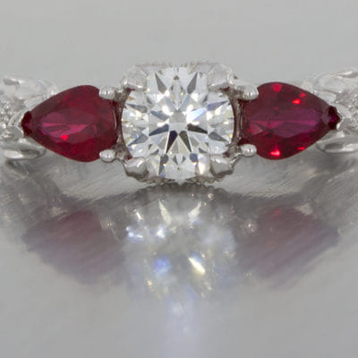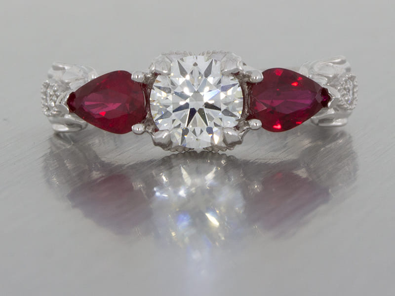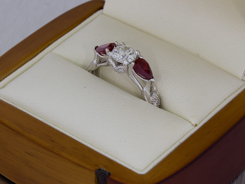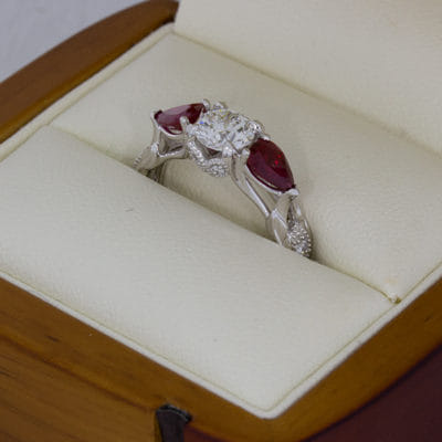Wonderfully organic, this centre round diamond is accented by two incredibly rich matching pear-shaped rubies. With leaves stemming from the shank growing up through the ring around marquise shaped elements pave set with round diamonds finished off with a milgrain edging to create a classic contrast between modern and classic.