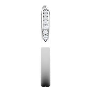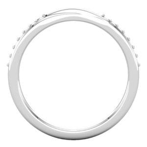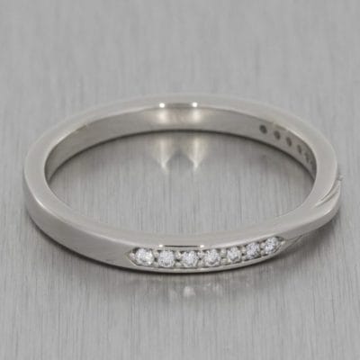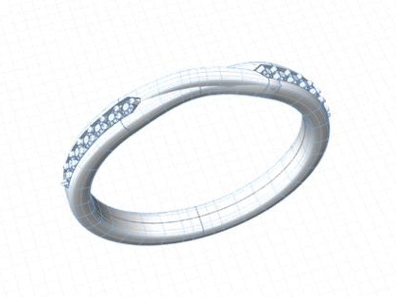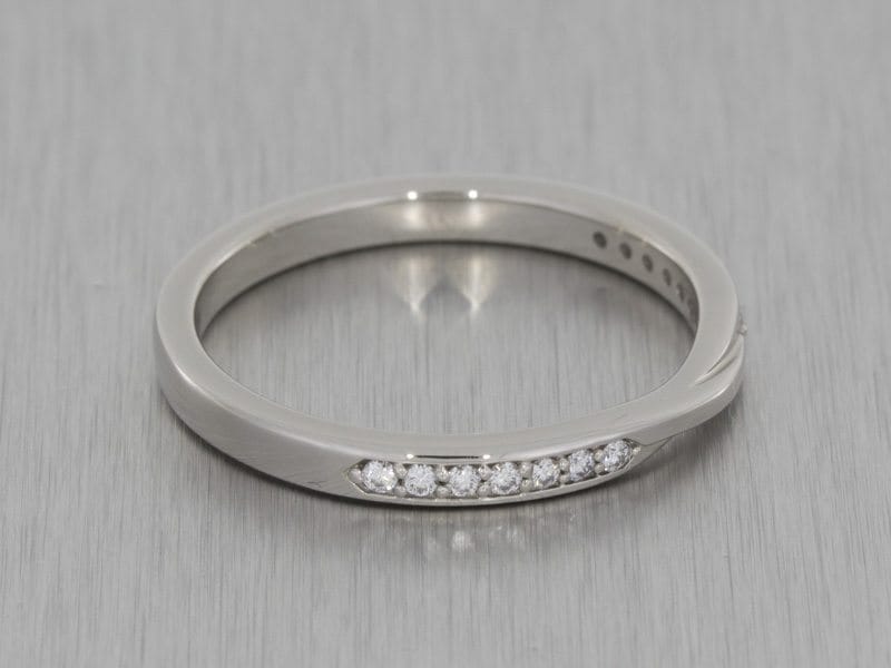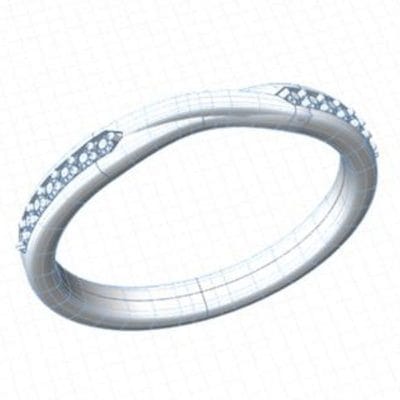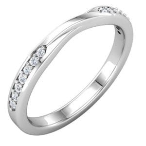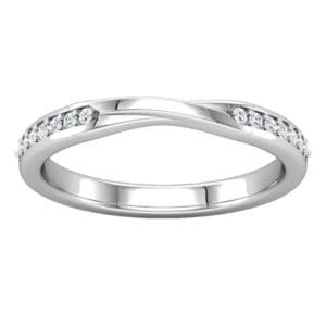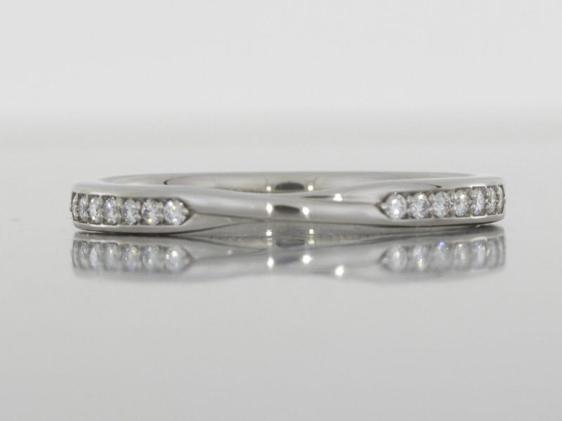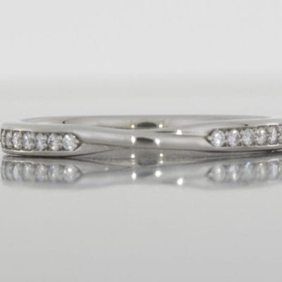 This custom wedding ring was created to perfectly fit alongside an existing engagement ring we created that featured an oval onyx split shank halo design. The little twist in the top allows a neat fitting next to the engagement ring and is an elegant solution to fitting a straight ring next to a ring with a central stone. The tapered channel of accent diamonds further tied it together with the engagement ring.