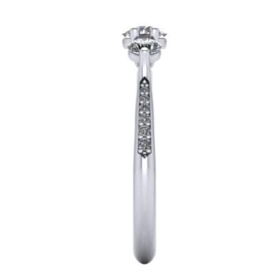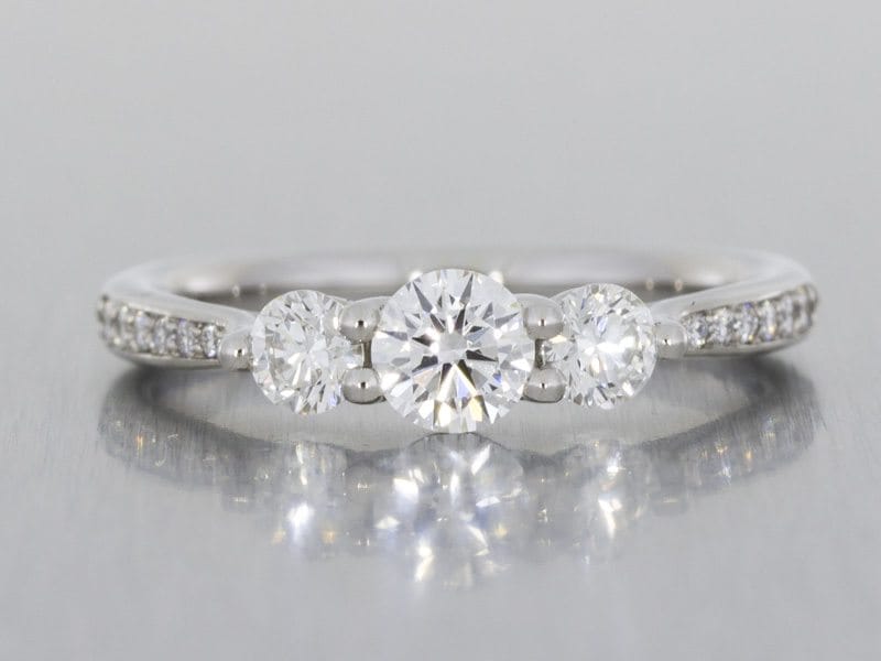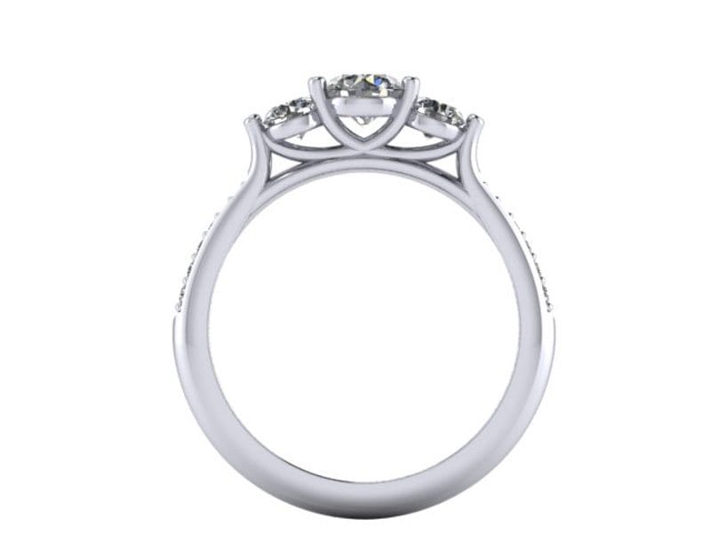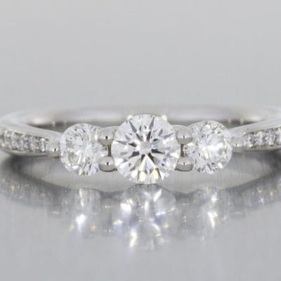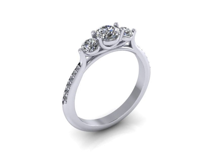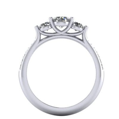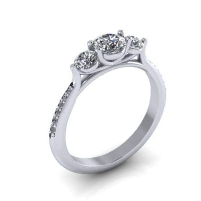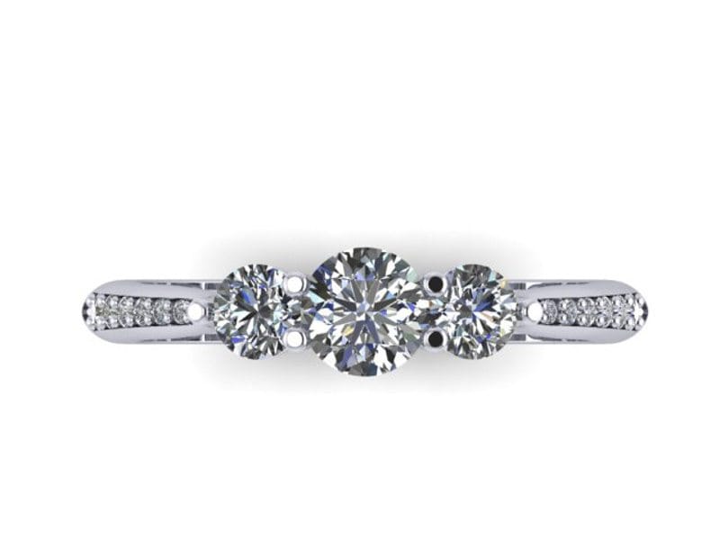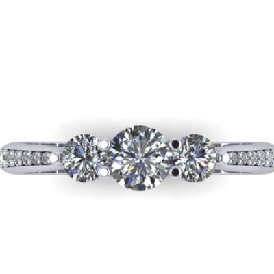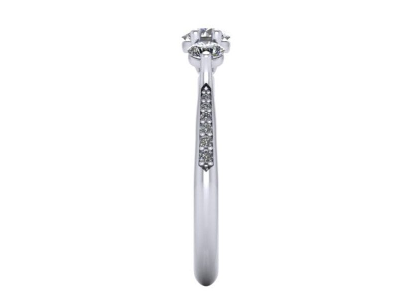 This timeless classic features three diamonds set in a trilogy, engagement-ring-style with a diamond-accented, cathedral-style ring shank. The design was given a slight twist by aligning the prongs for the centre and side diamonds in a contemporary and minimalist way. The outer prongs become the shank, creating a fluid transition from the centre feature into the ring band.