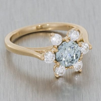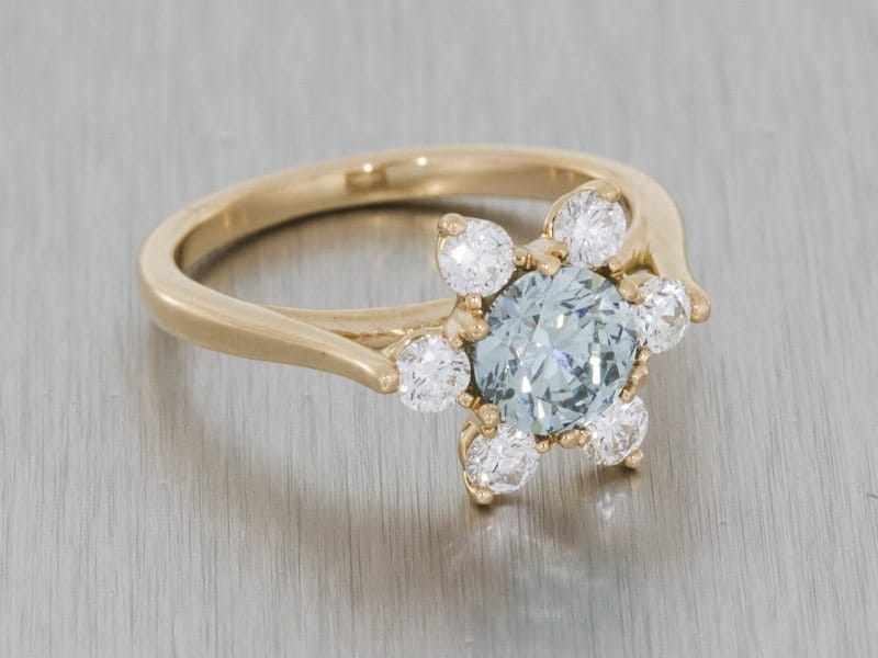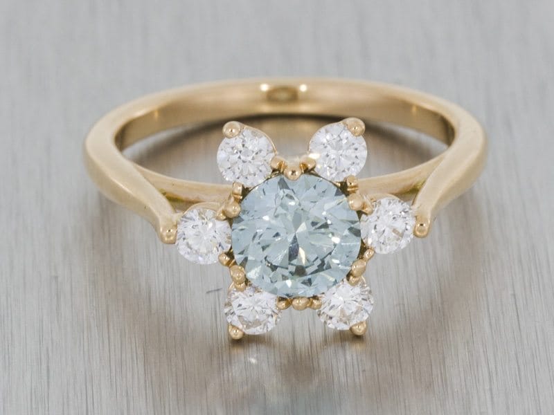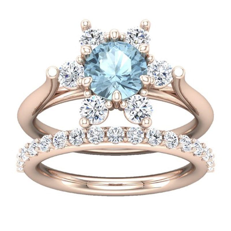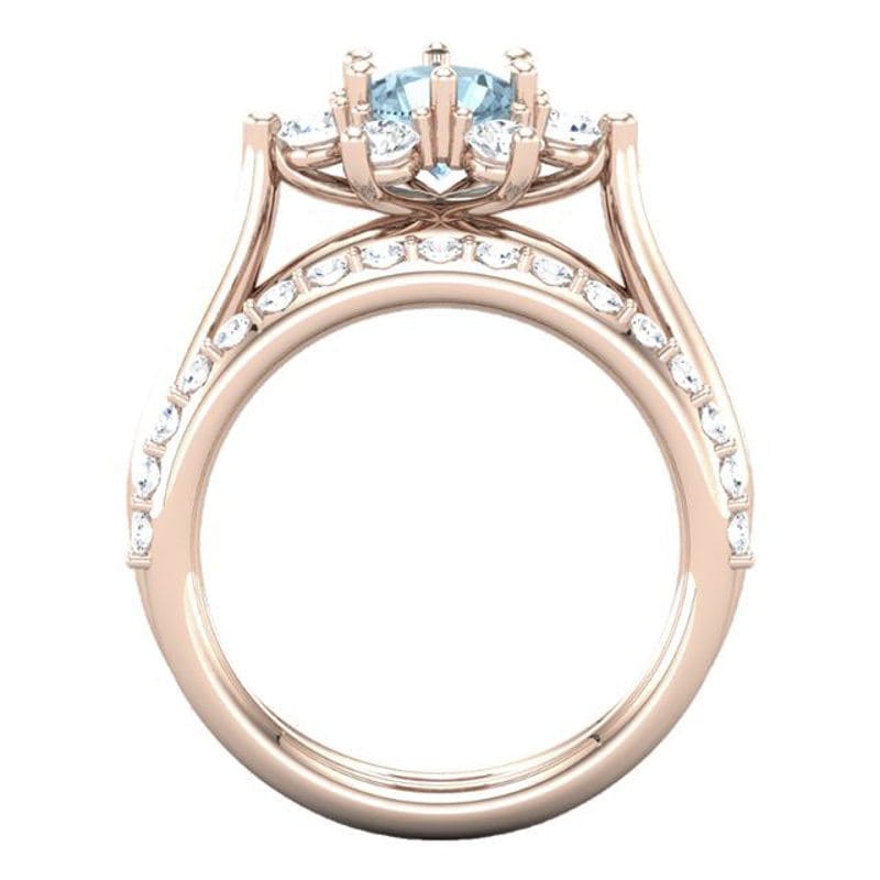 This truly bespoke floral engagement ring was chosen as our 'Ring of the Week'. This unique engagement ring was set in a rich, warm 14kt rose gold. The brilliant, round cut aqua blue diamond center stone creates a strong focal feature whilst subtly drawing the eye to the white diamond accent stones. Each of the accent stones symbolically represents a flower petal to complete the flower head design.
