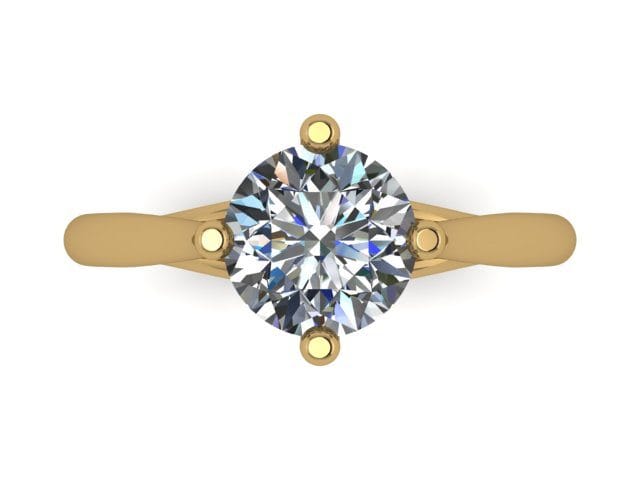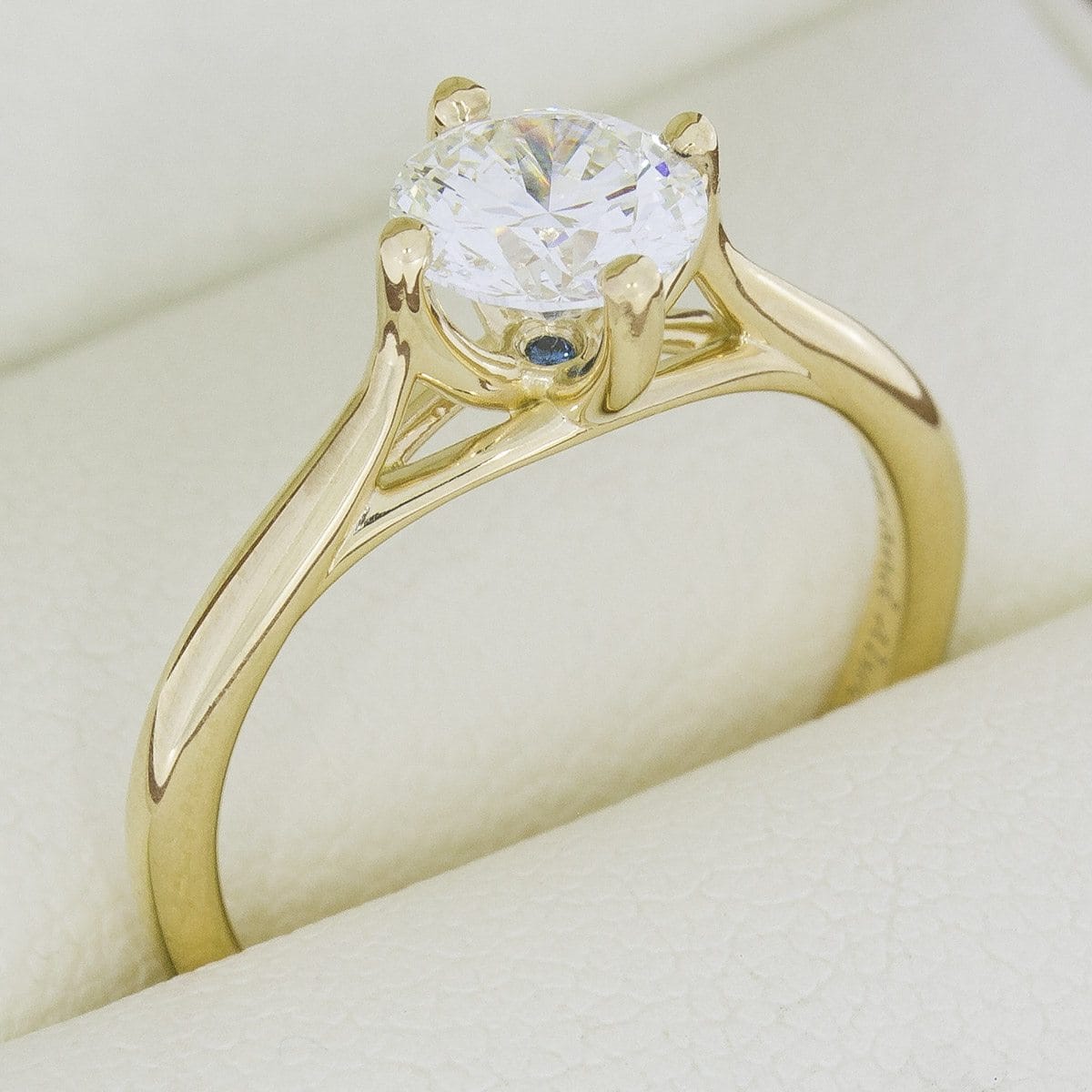This simple and elegant solitaire engagement ring is our ‘Ring of the Week’. The delicate 18kt yellow gold band accommodates a modern brilliant round cut diamond centre. This centre stone is nestled in a simple but unusual North South East and West four claw setting. We added a Teal Blue diamond which is set directly below the culet of the diamond to assist the bride with her ‘something blue’ on what will, no doubt, become one of the most important days of her life.