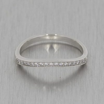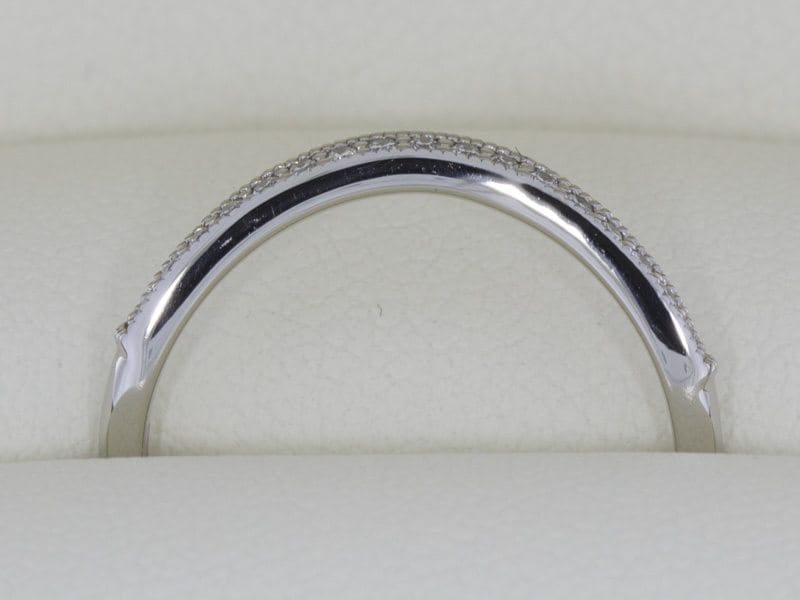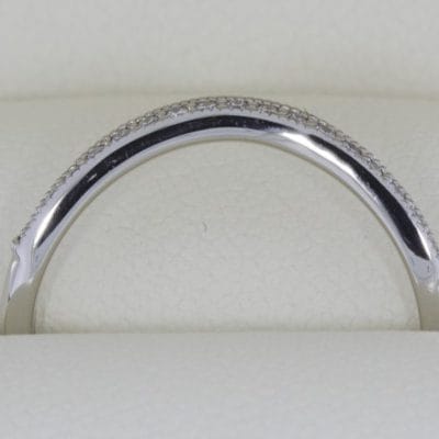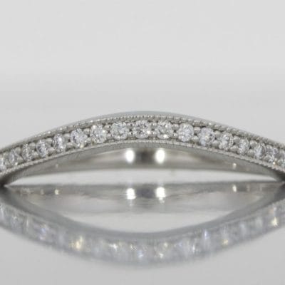 This delicate wedding band was designed to compliment an existing engagement ring. It features a selection of precision cut white diamonds nestled in the band. The ring also features a soft milgrain detailing to complete the intricate design.