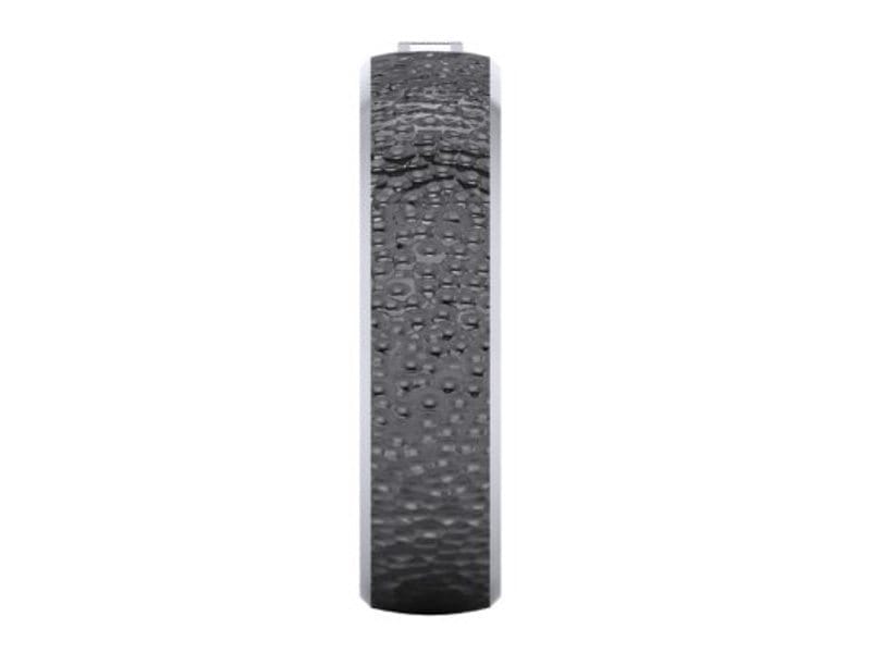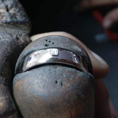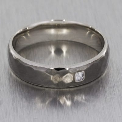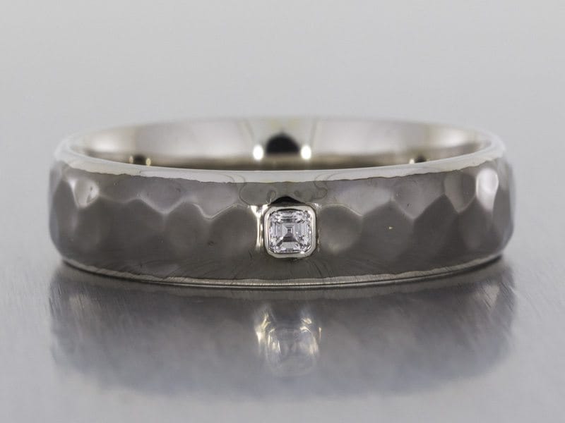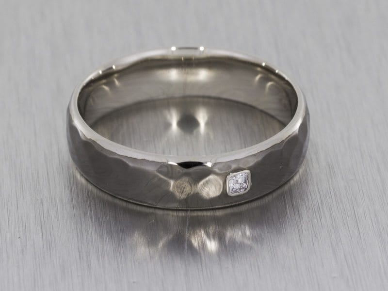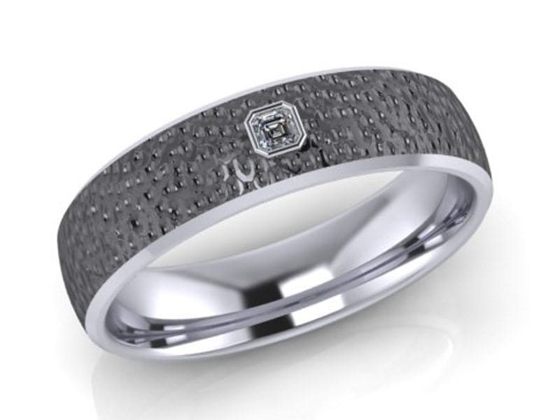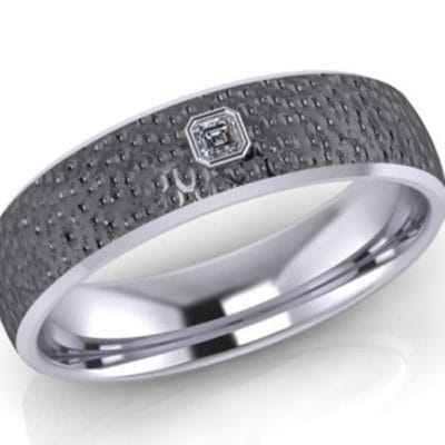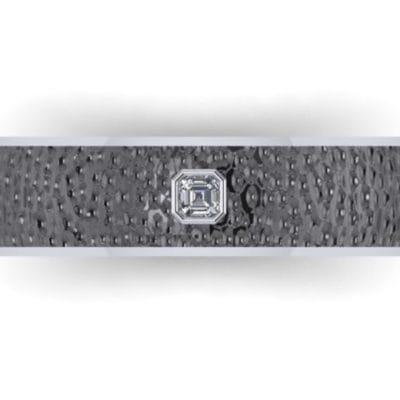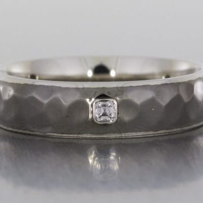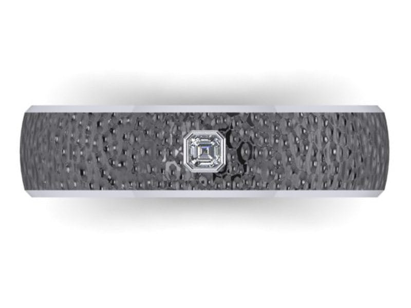 A dramatic and striking wedding band made in palladium with black rhodium plating to give it the dark and edgy look. The ring has been given a hammered effect and had an asscher cut diamond gypsy set into the band.