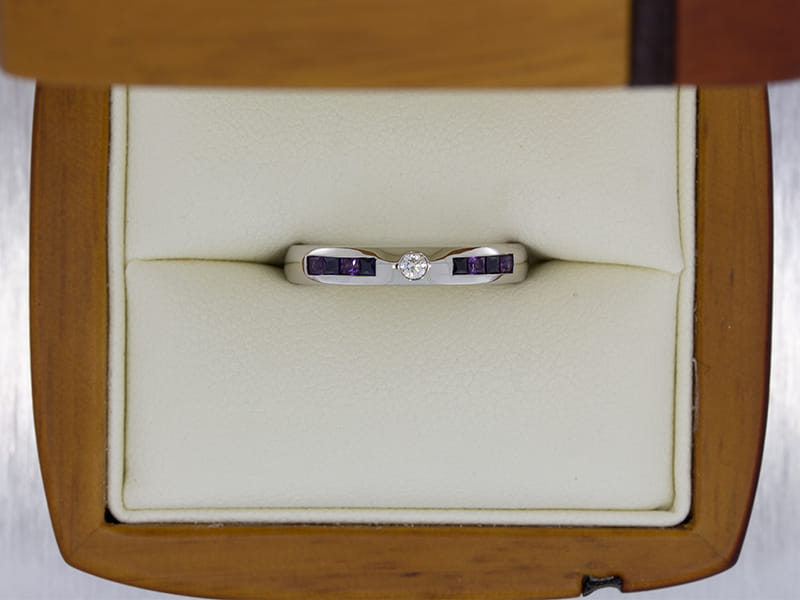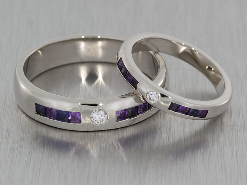 His and hers palladium wedding bands to match a previous engagement ring we helped to create. The bands are both comfort fit and set with a round brilliant cut diamond in the centre and then alternating princess cut amethysts and sapphires, which are the birthstones of the couple- making these rings incredibly sentimental.
