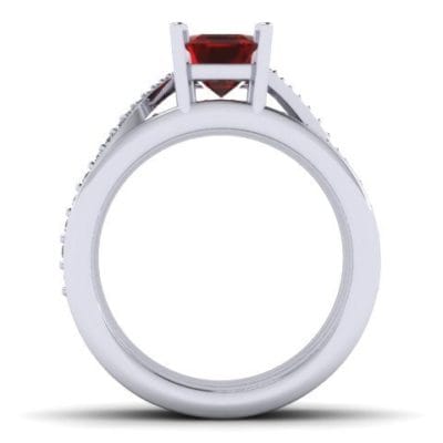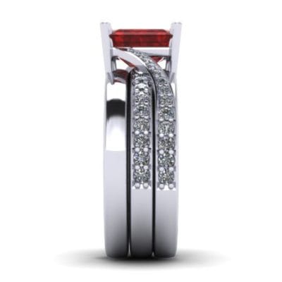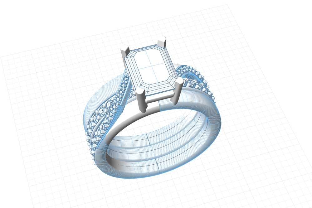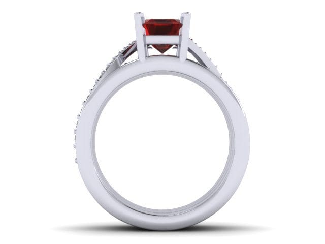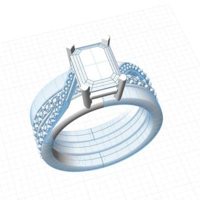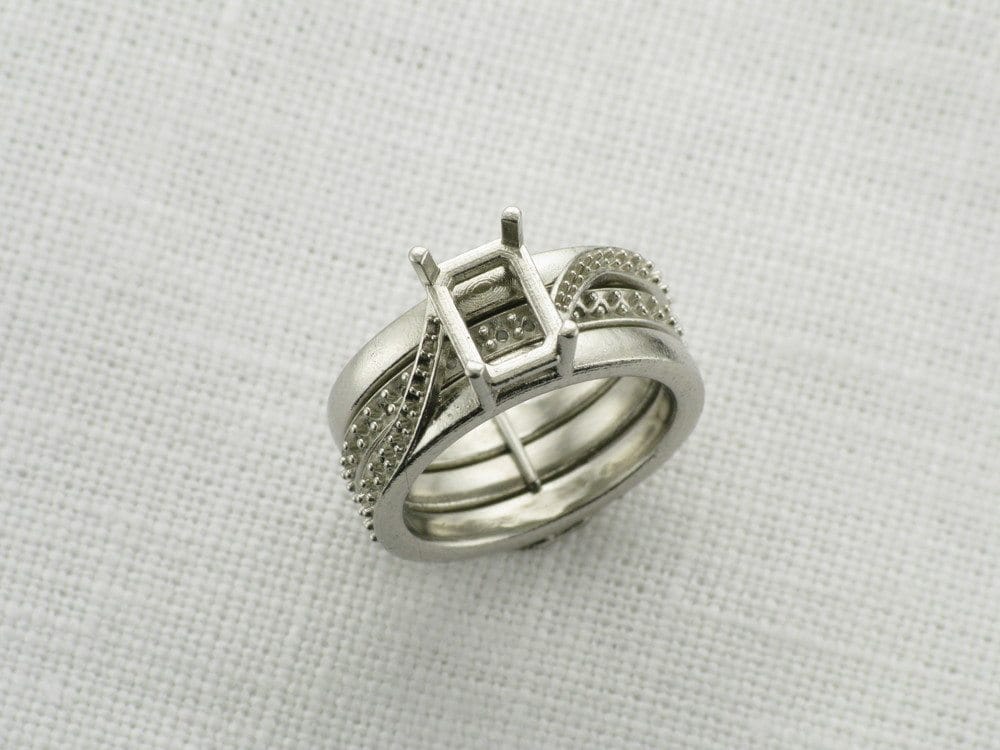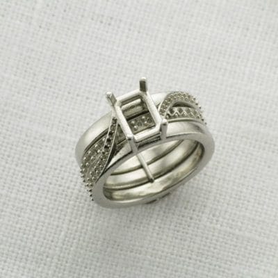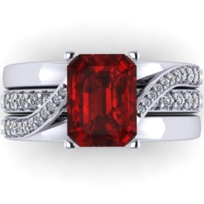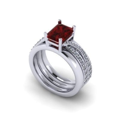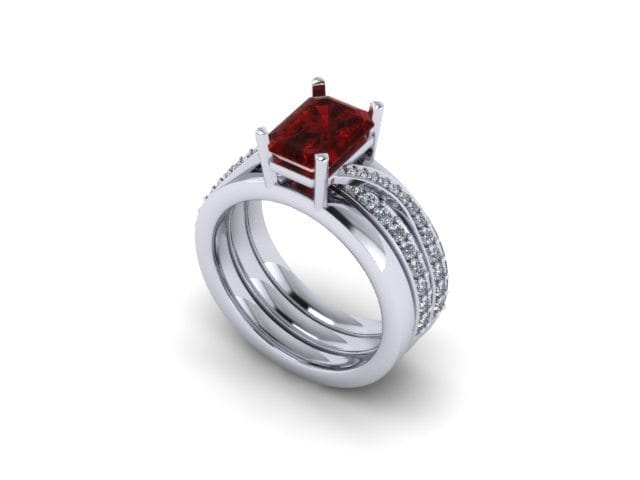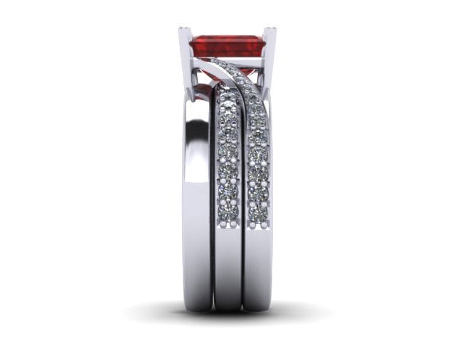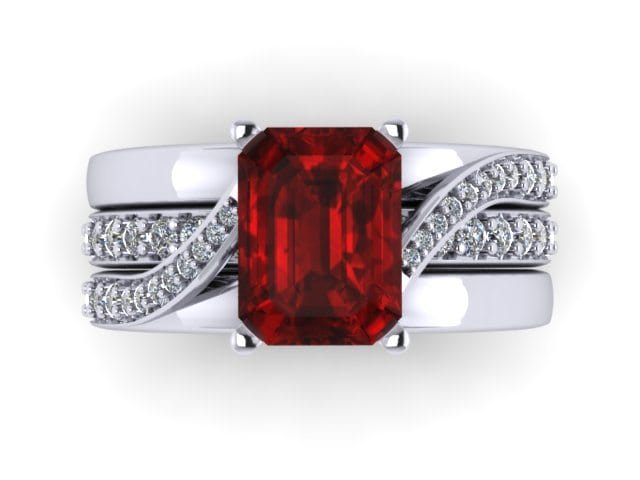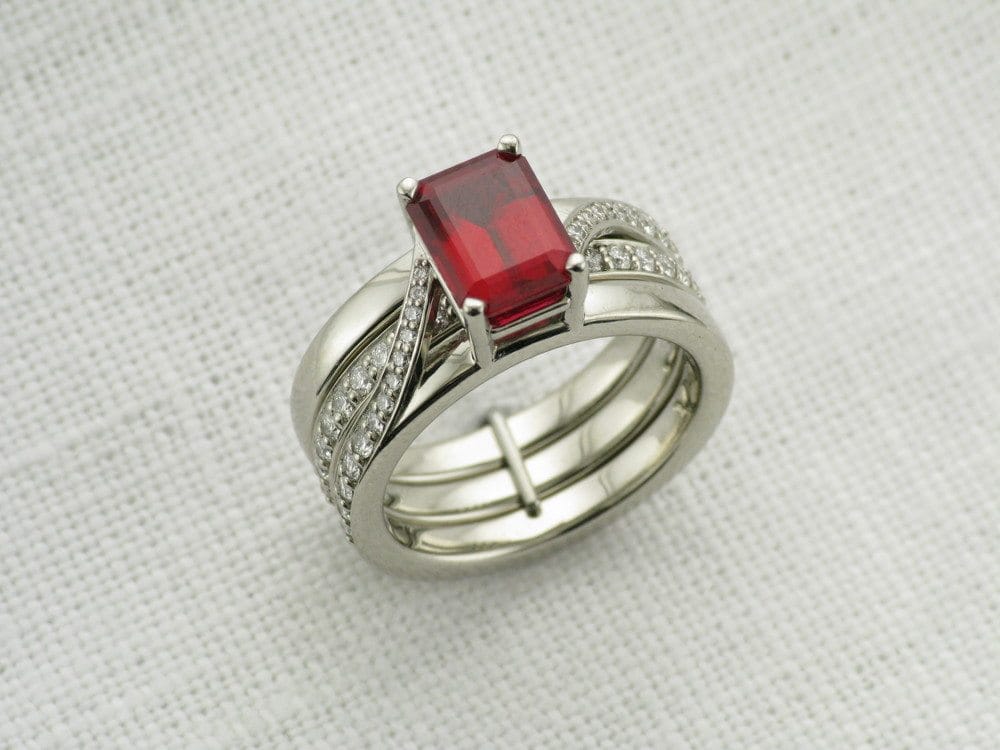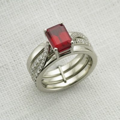 Being in the bespoke jewellery industry we find our customers are looking for something unique that they can’t find in high street jewellers. This was the case with this customer. He was very decisive that the wedding band and the engagement ring were to be seen as one piece of jewellery. This type of ring is sometimes referred to as an interlocking wrap ring. The wedding band slides out from between the two plain bands to reveal a separate engagement ring and wedding band. The diamonds are set in palladium with the split shank leading up to the emerald cut ruby in the centre.