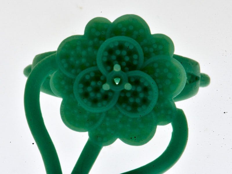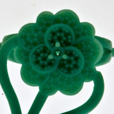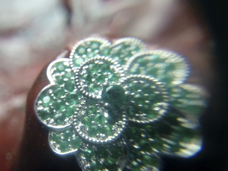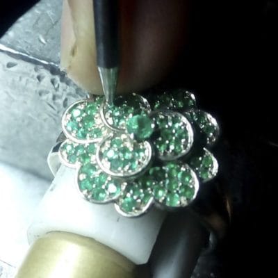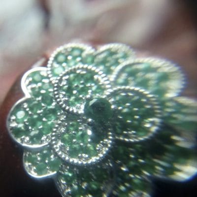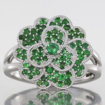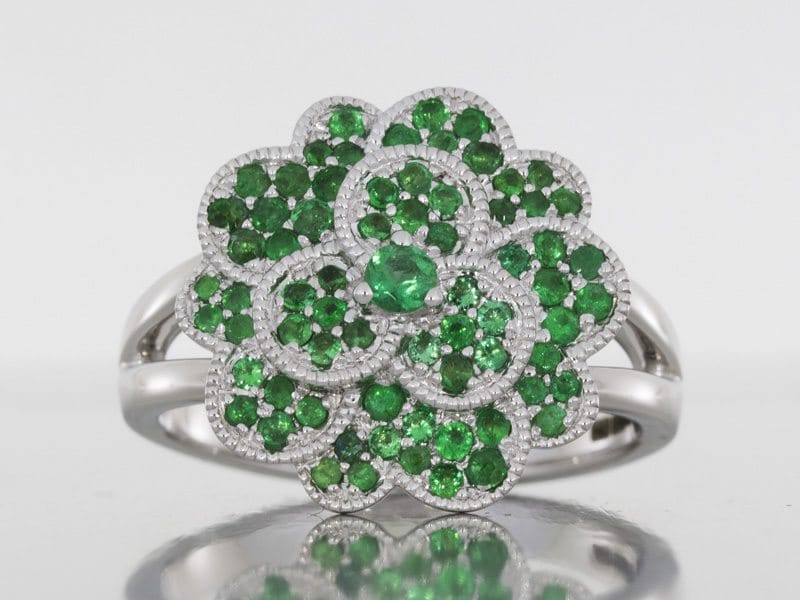 This full bloom 18kt white gold, green pave, emerald carnation ring was designed as an homage to Oscar Wilde. The petals undulate around a centre emerald and are finished with milgrain for an added floral flourish. The shank of this ring is split to allow an even distribution of weight for the centrepiece.