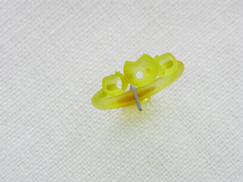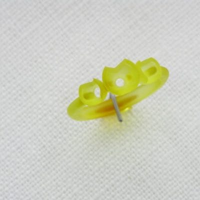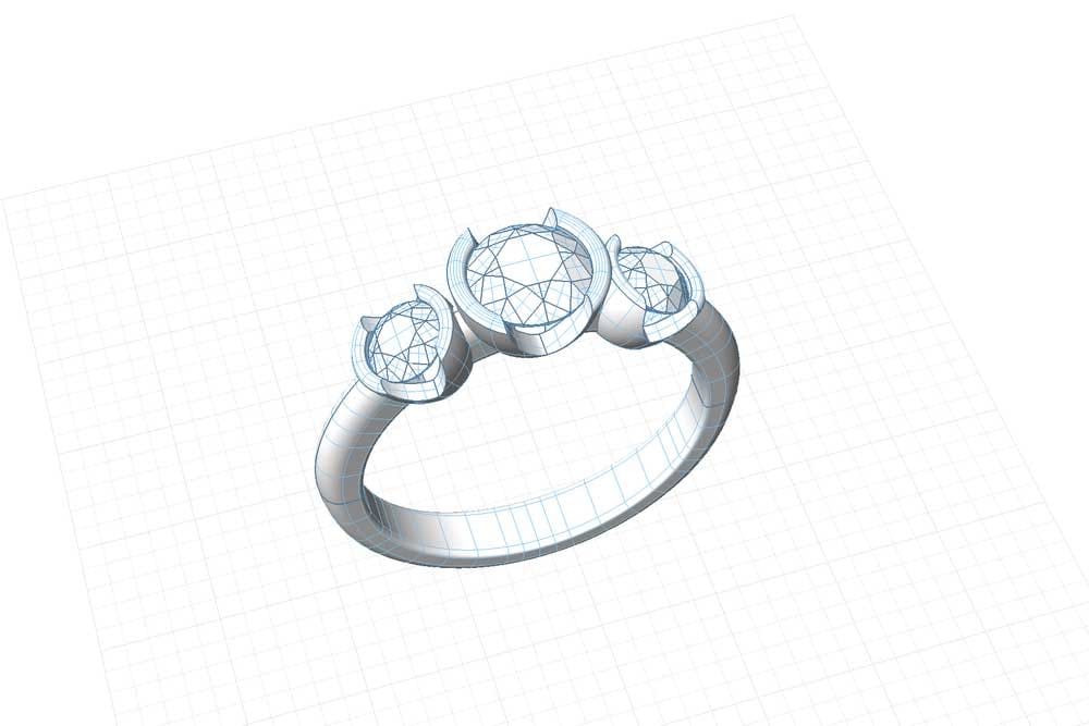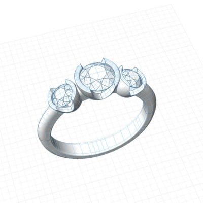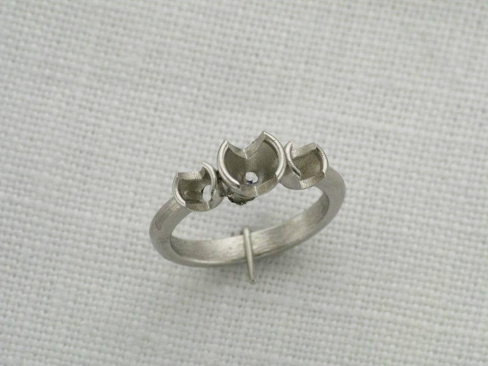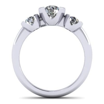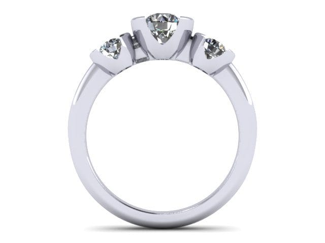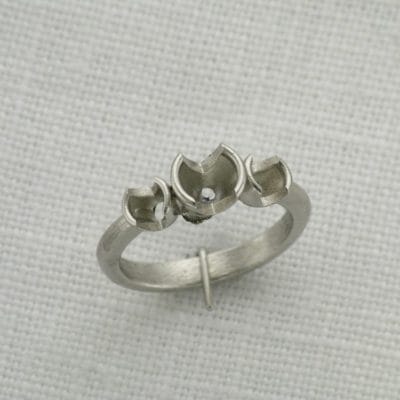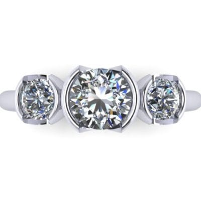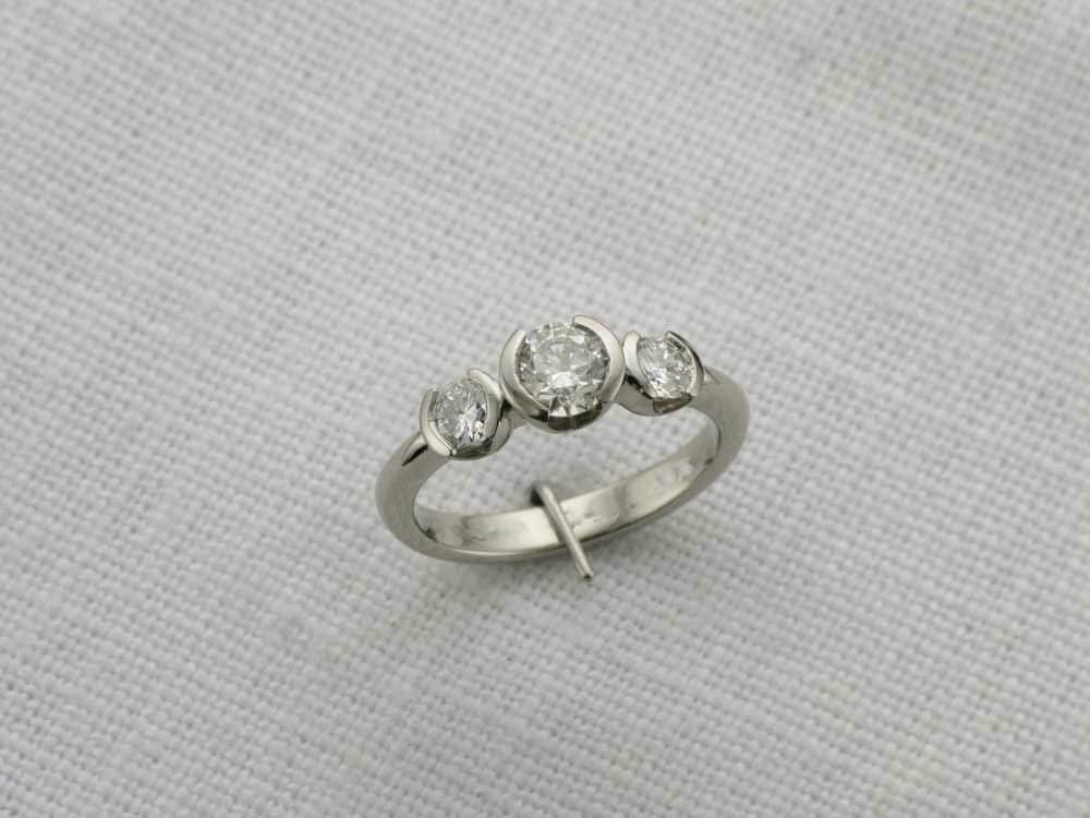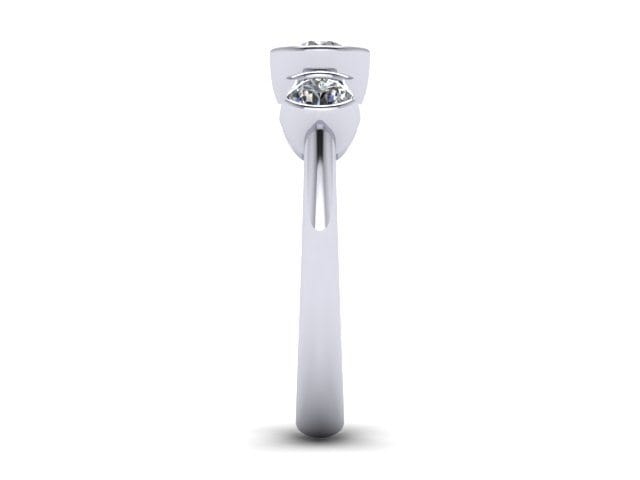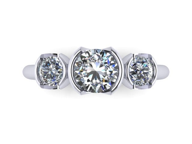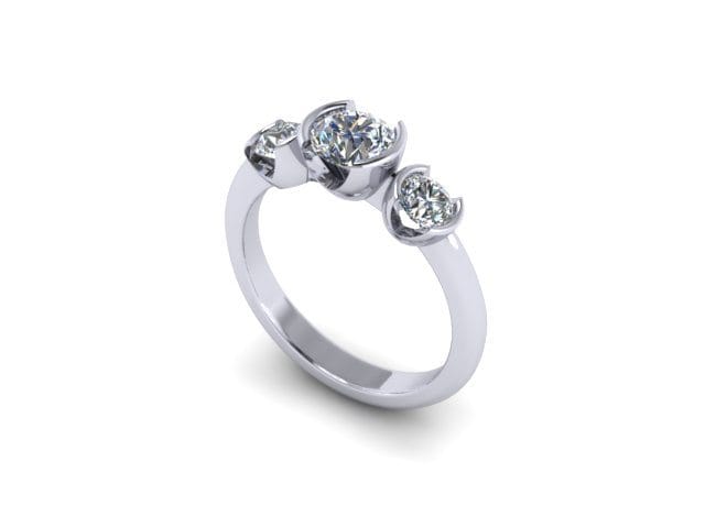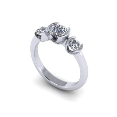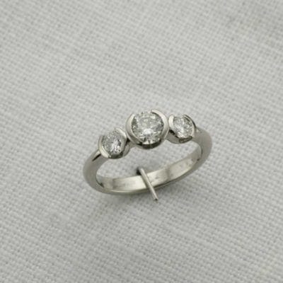 This simple three stone ring made in palladium is set with three modern round brilliant cut diamonds all in a half bezel setting. (also known as half rub over) From the through finger view you can see the scalloped edges which show off the diamonds beautifully letting light through the stone.