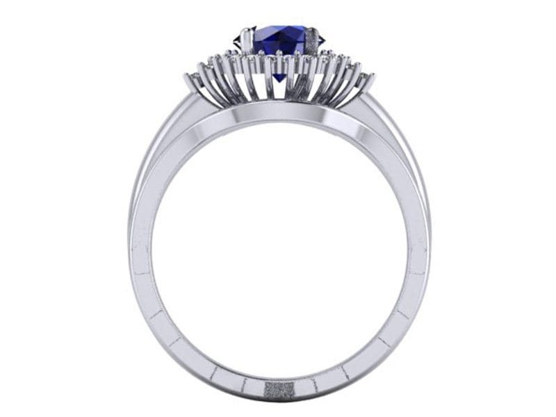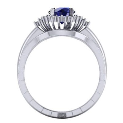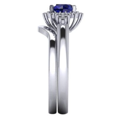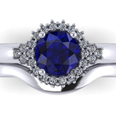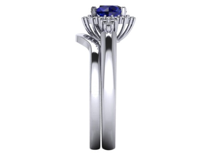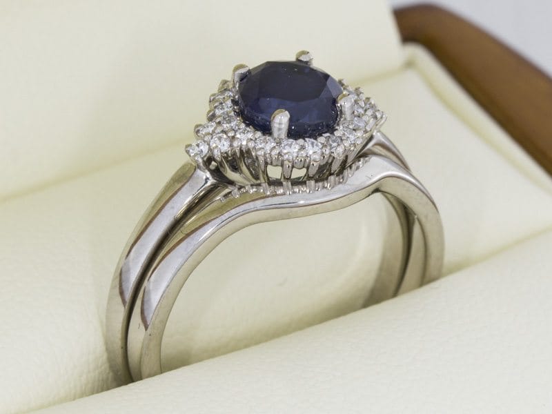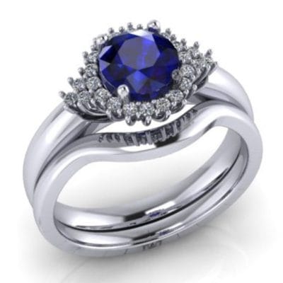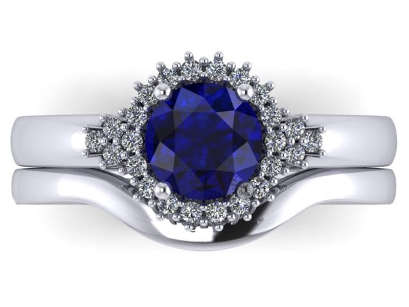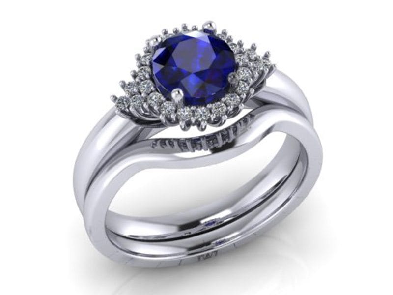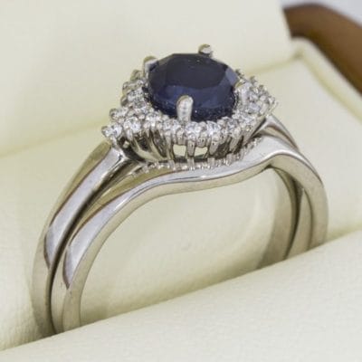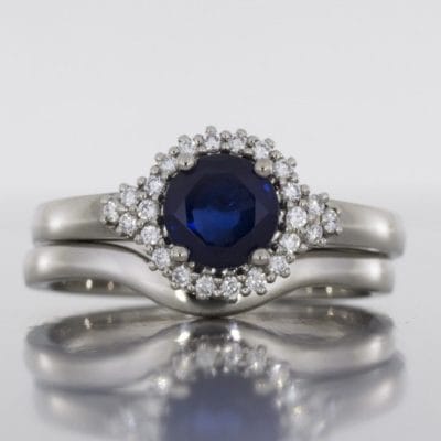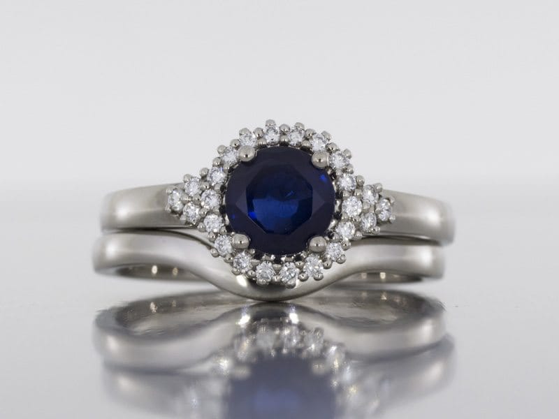 Vintage inspired palladium wedding band set with a striking engagement ring set with a blue sapphire surrounded by a cluster of diamonds, with intricate wire work holding them in place. And a contoured palladium wedding band sitting snugly around the diamond cluster so both rings stay in place without moving.