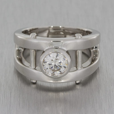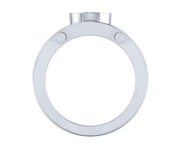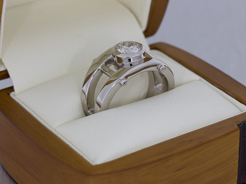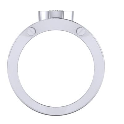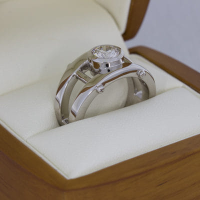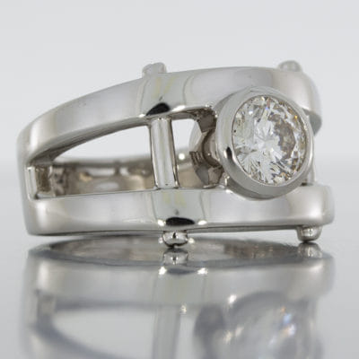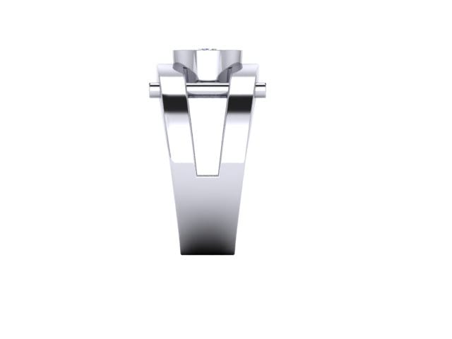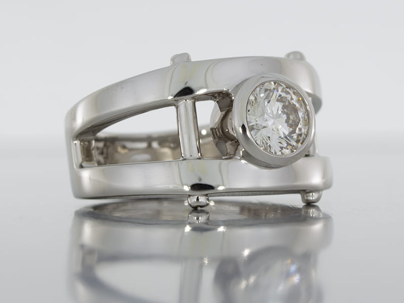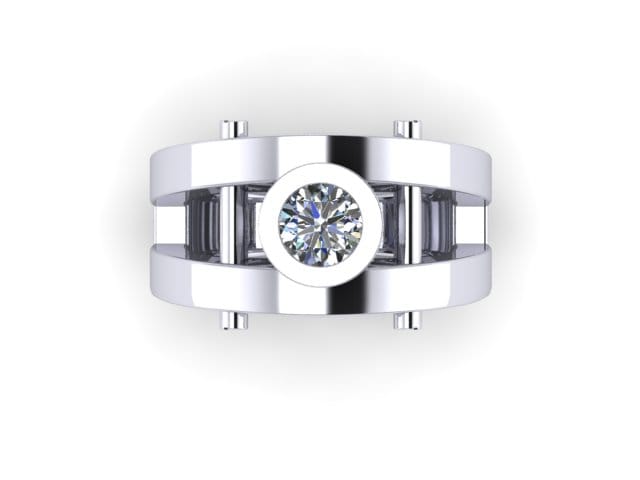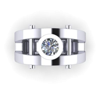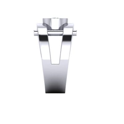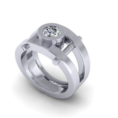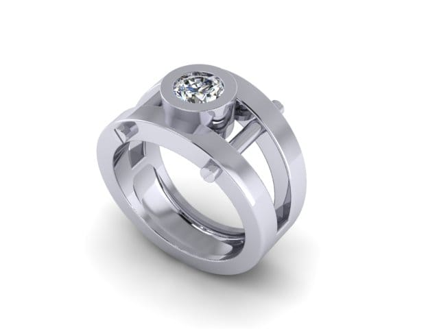 This striking gents ring made in palladium features a 1ct diamond bezel set in a split shank which is held together by two bars which are made to look like screws. A heavy and masculine ring offset by the sparkle of the diamond.