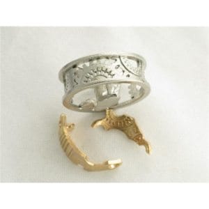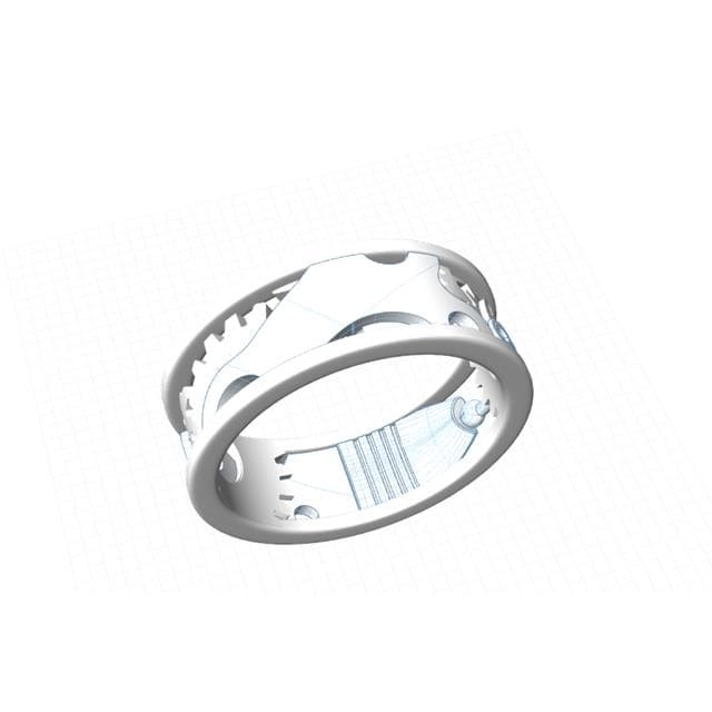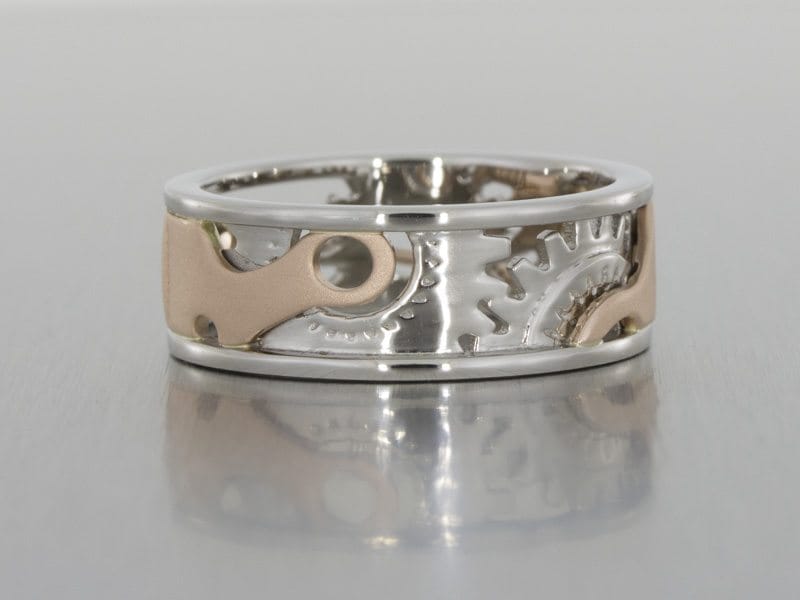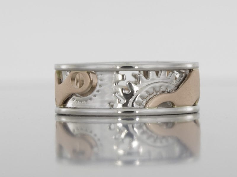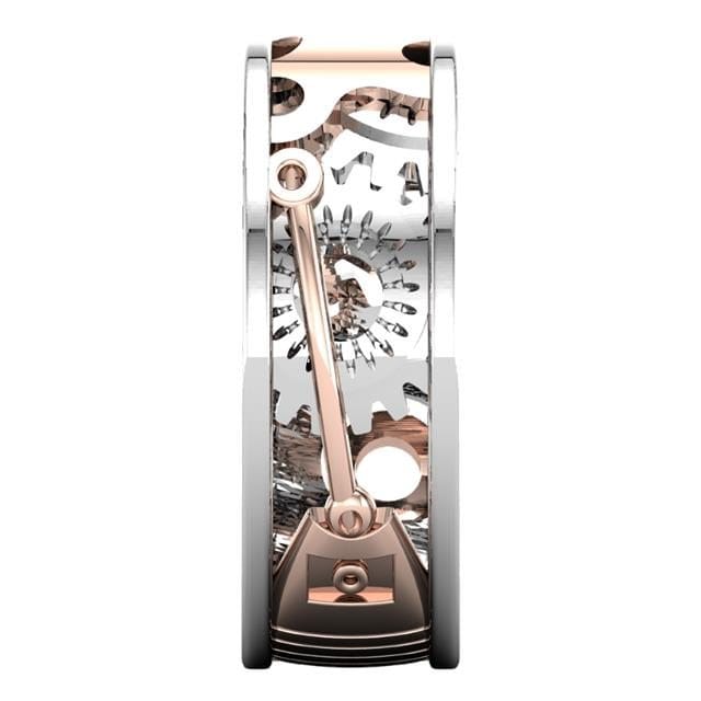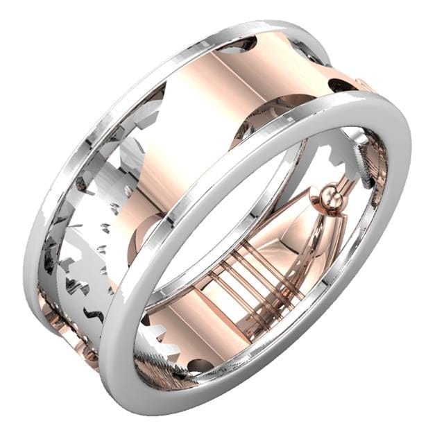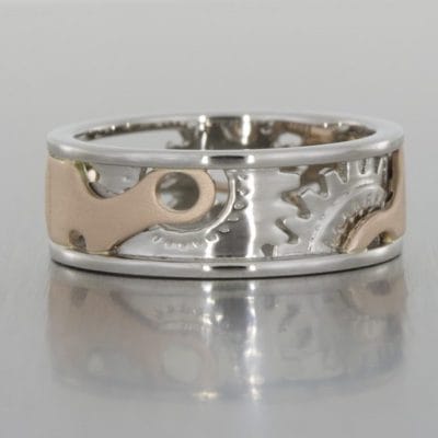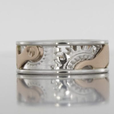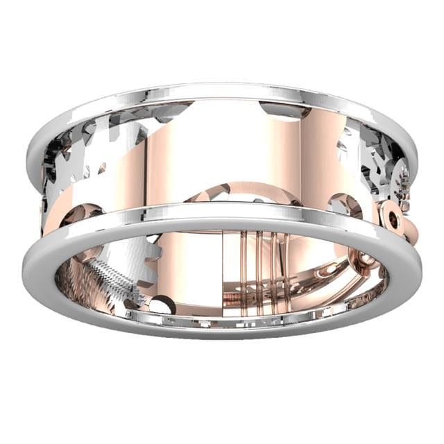 This wonderfully unique take on a men's band ring was presented to us by an Engineer. Rose gold Gears and parts were combined within a palladium edged band to create a high end steampunk style men's ring.