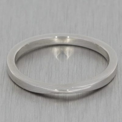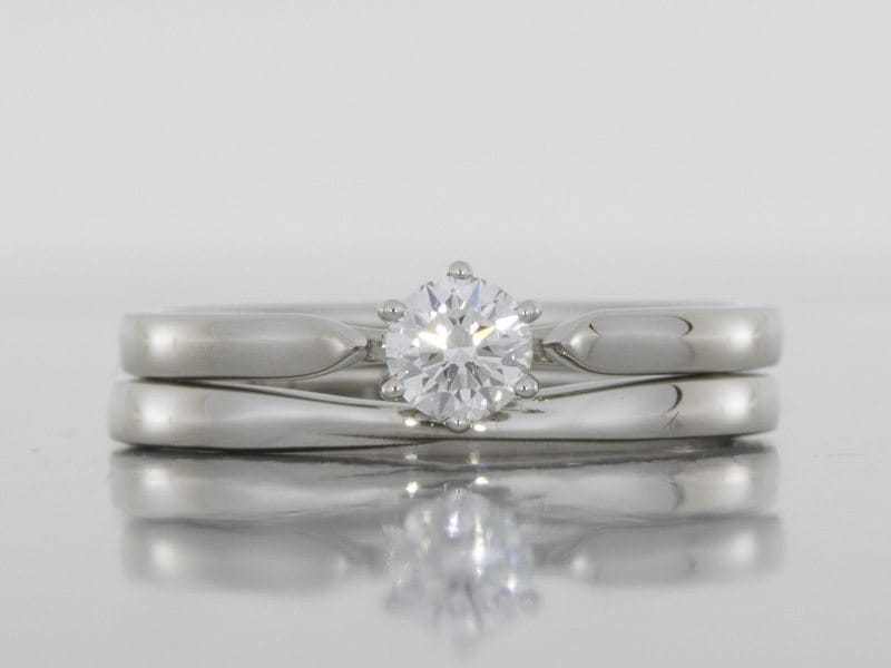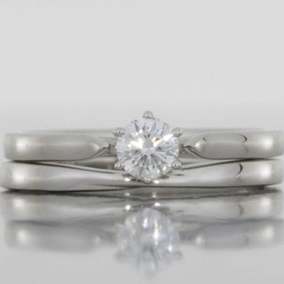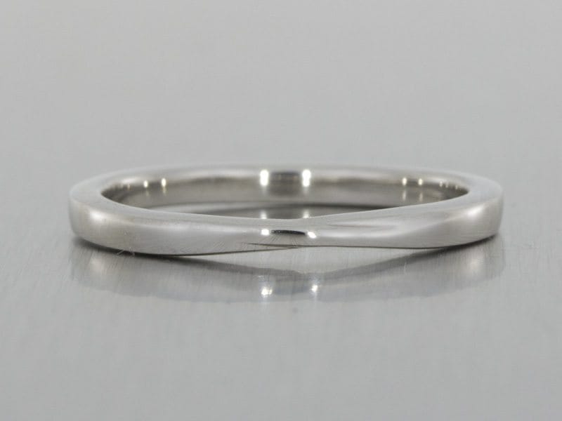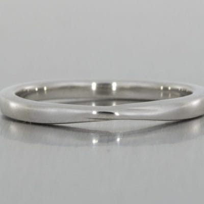 This pretty bow tie style platinum wedding ring was created to sit perfectly beside a unique solitaire engagement ring that we designed. The top twist, is similar to a mobius style ring, but on a much smaller and delicate scale. By including the twist, it provides a space to sit flush to the solitaire engagement ring.