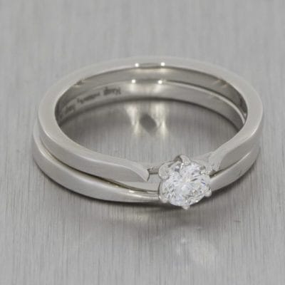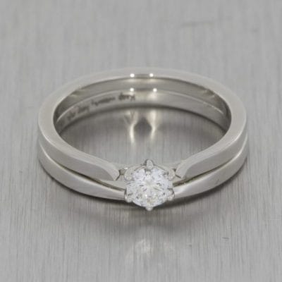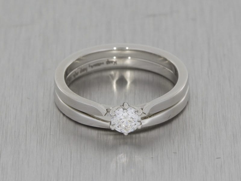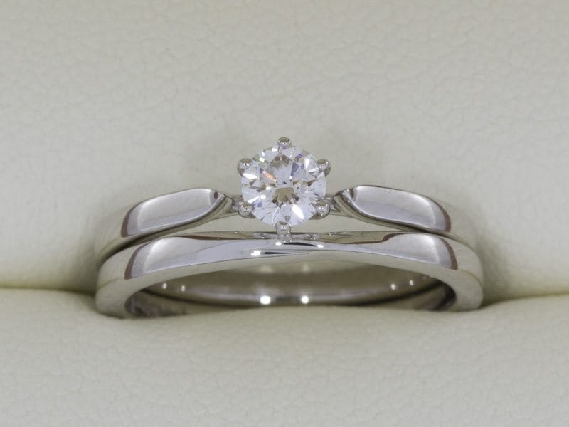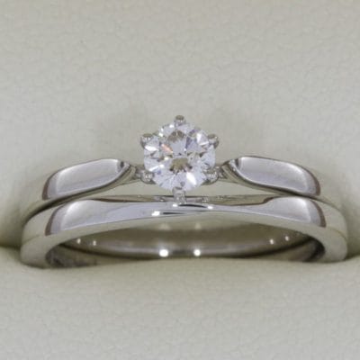 This chic and classic solitaire engagement ring has been given a twist by creating a custom cathedral shank that acts as additional design elements by utilising negative space between the pinched tips of the ring shank arms and the beautiful centre diamond. An additional wedding band was created for this engagement ring to create a bespoke ring set.