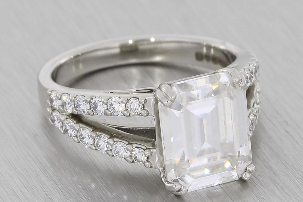 - Price – Moissanite will always be cheaper than diamond. Some sources state that moissanite can actually cost up to 90% less than a similarly sized diamond. And that is a serious consideration when designing your engagement ring.
