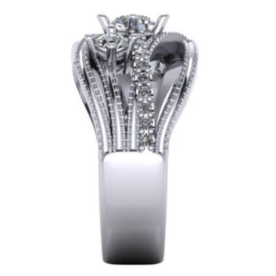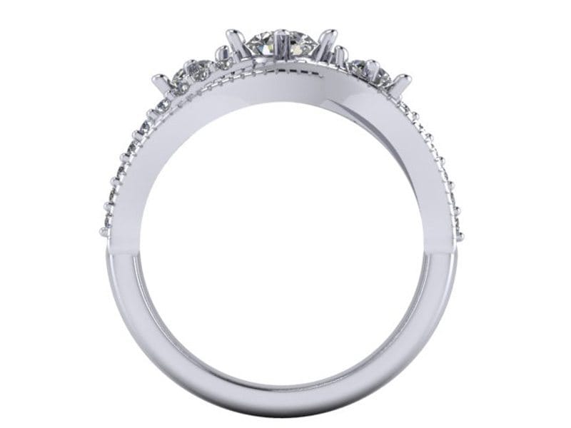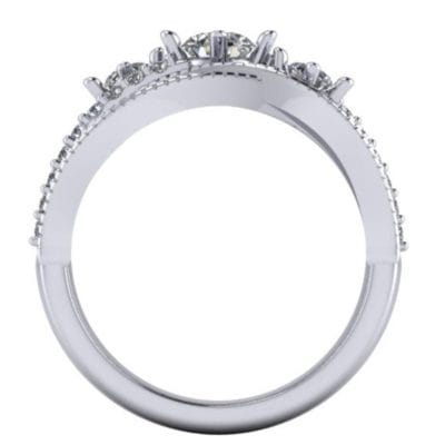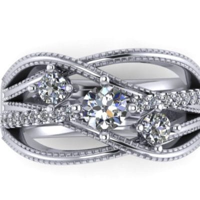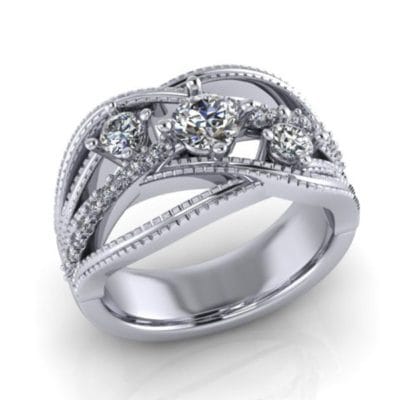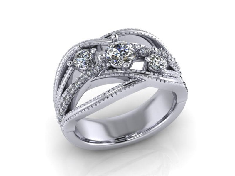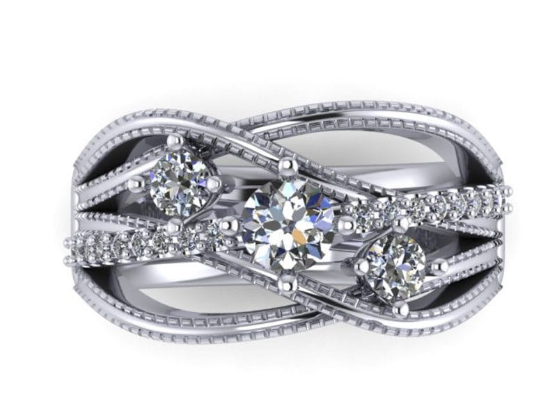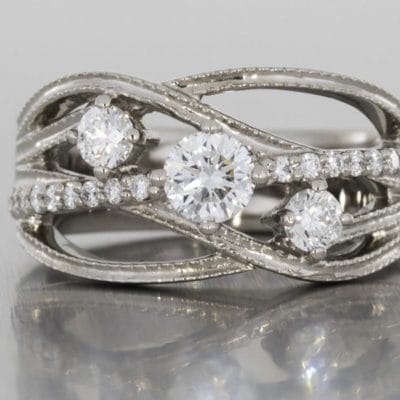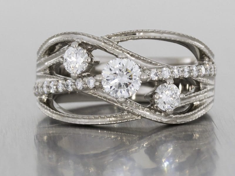 This beautiful diamond wrap ring features a slightly modified take on milgrain, adding a vintage flavour to the overall look of this unique engagement ring. Three round brilliant diamonds were selected with a single row of grain set accent diamonds with the remaining wrap bands channeled with the modified milgrain pattern to create this comfortable and textural bespoke ring design.