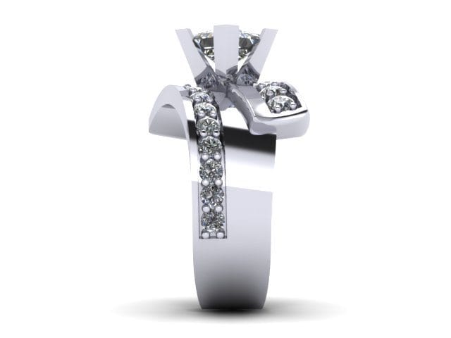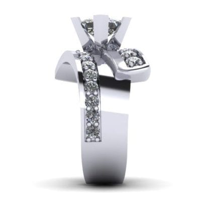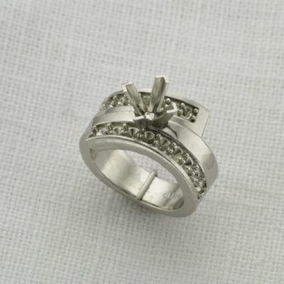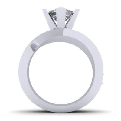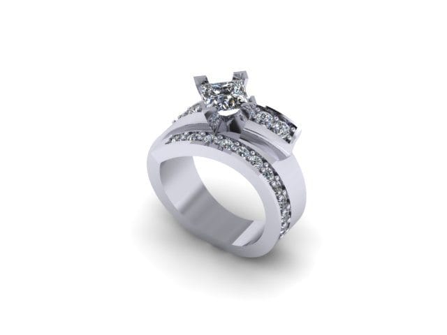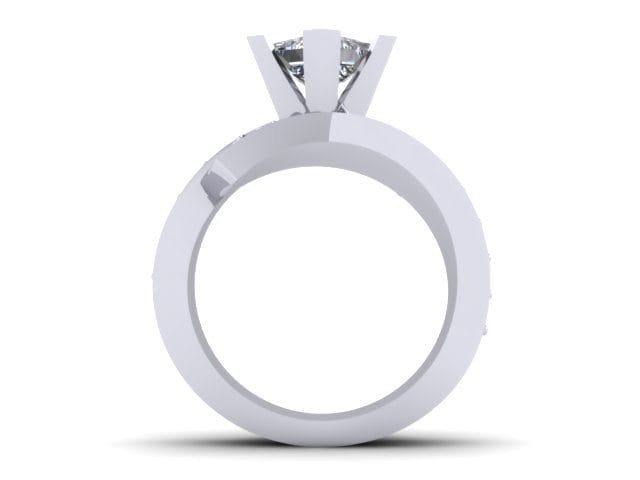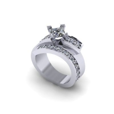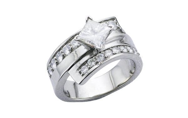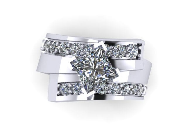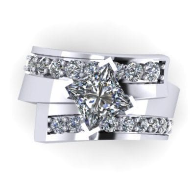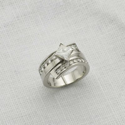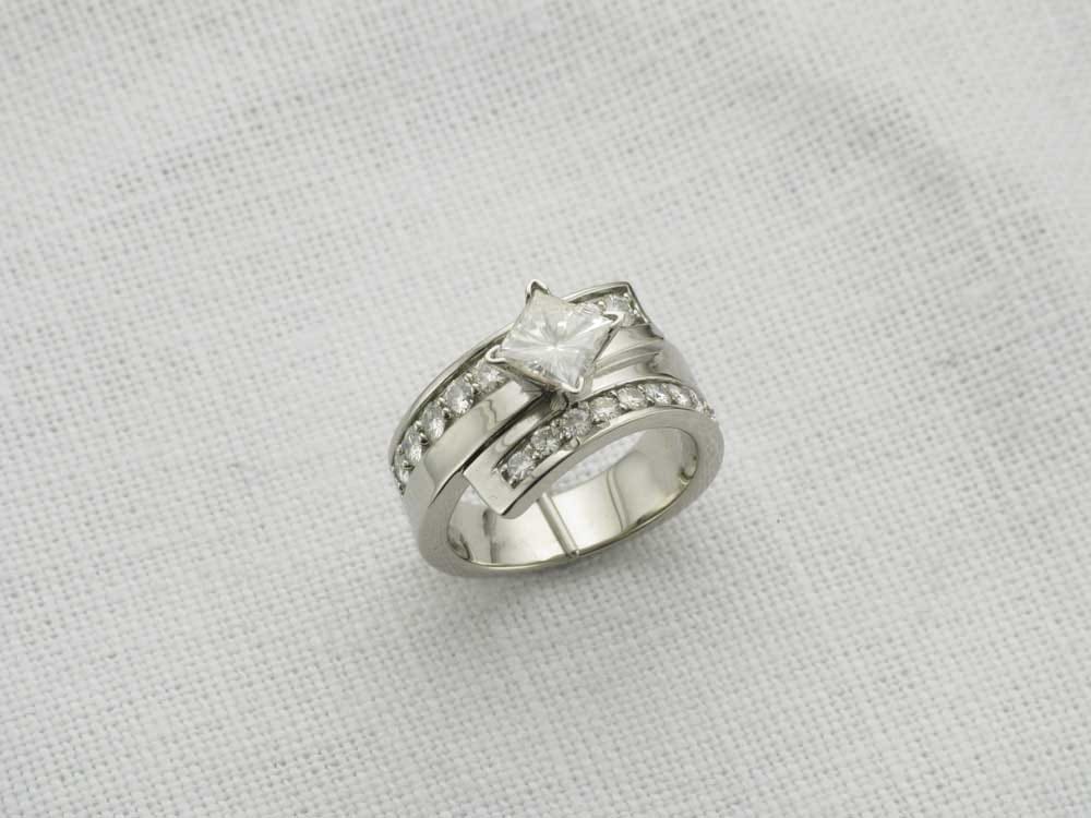 Princess cut moissanite in an angular corner claw setting set on top of a palladium band. Using corner claws is a classic way of setting a princess cut stone as opposed to a simple 4 claw setting as it follows the contours of the moissanite.The melee stones (also known as accent stones) are bead set in the shoulders of the band.
