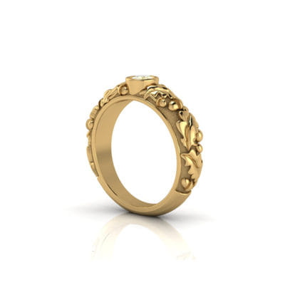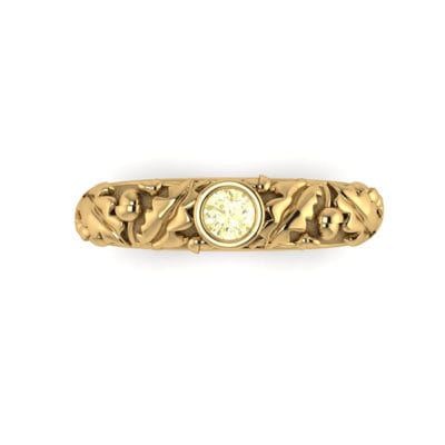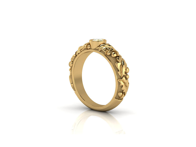 Using a strikingly rich yellow lab grown diamond for the centre. This yellow gold organic design inspired by the acorn and its distinctly shaped leaves encases the stone-like its part of the tree.