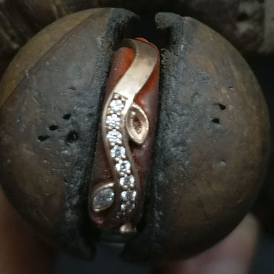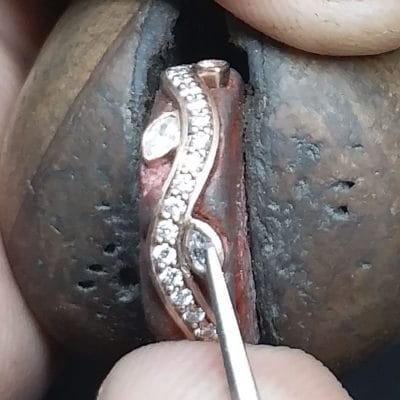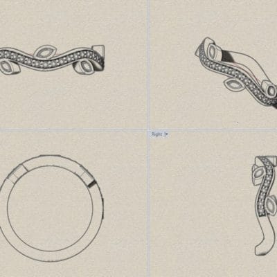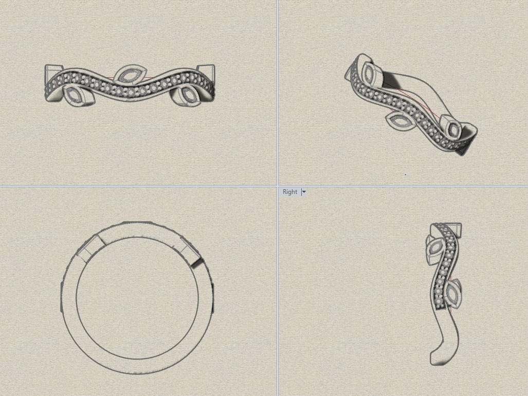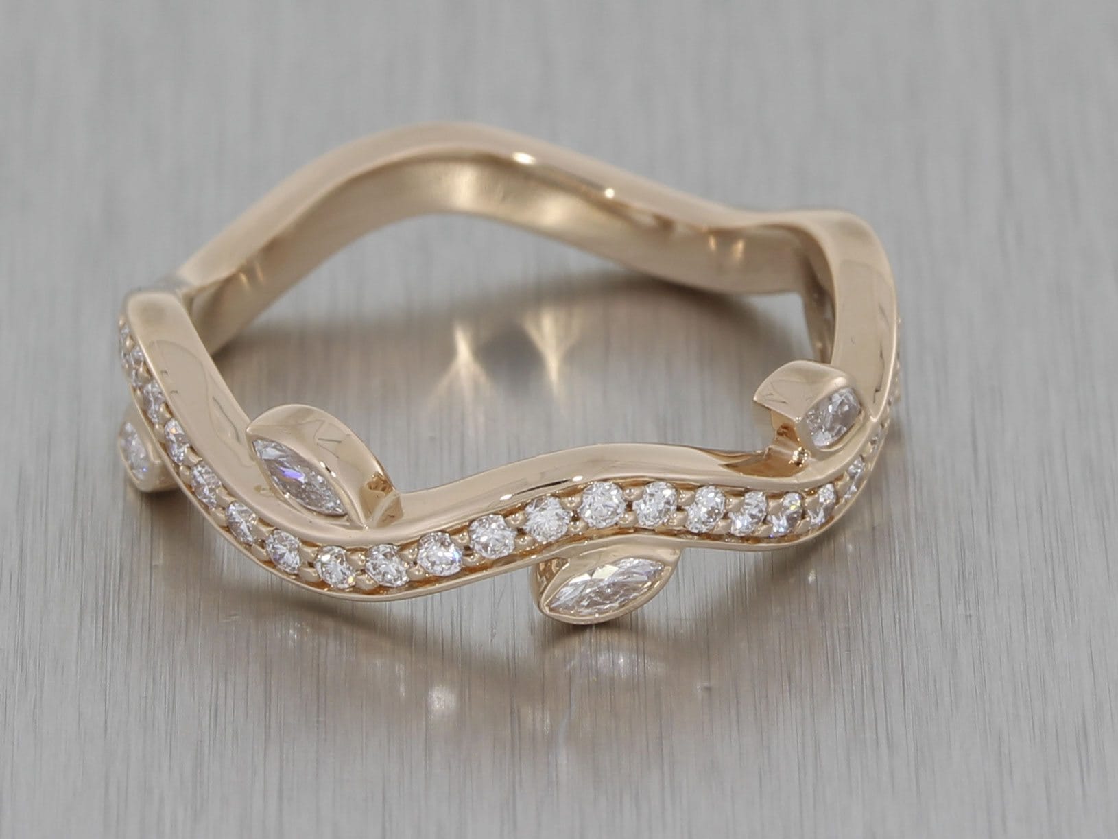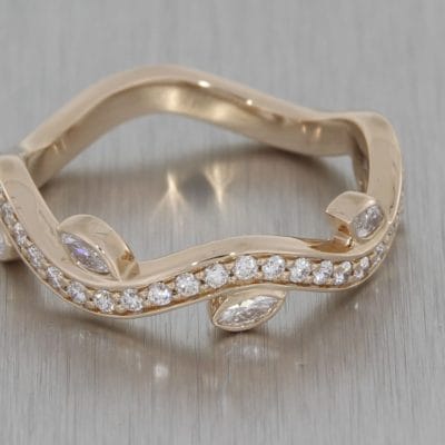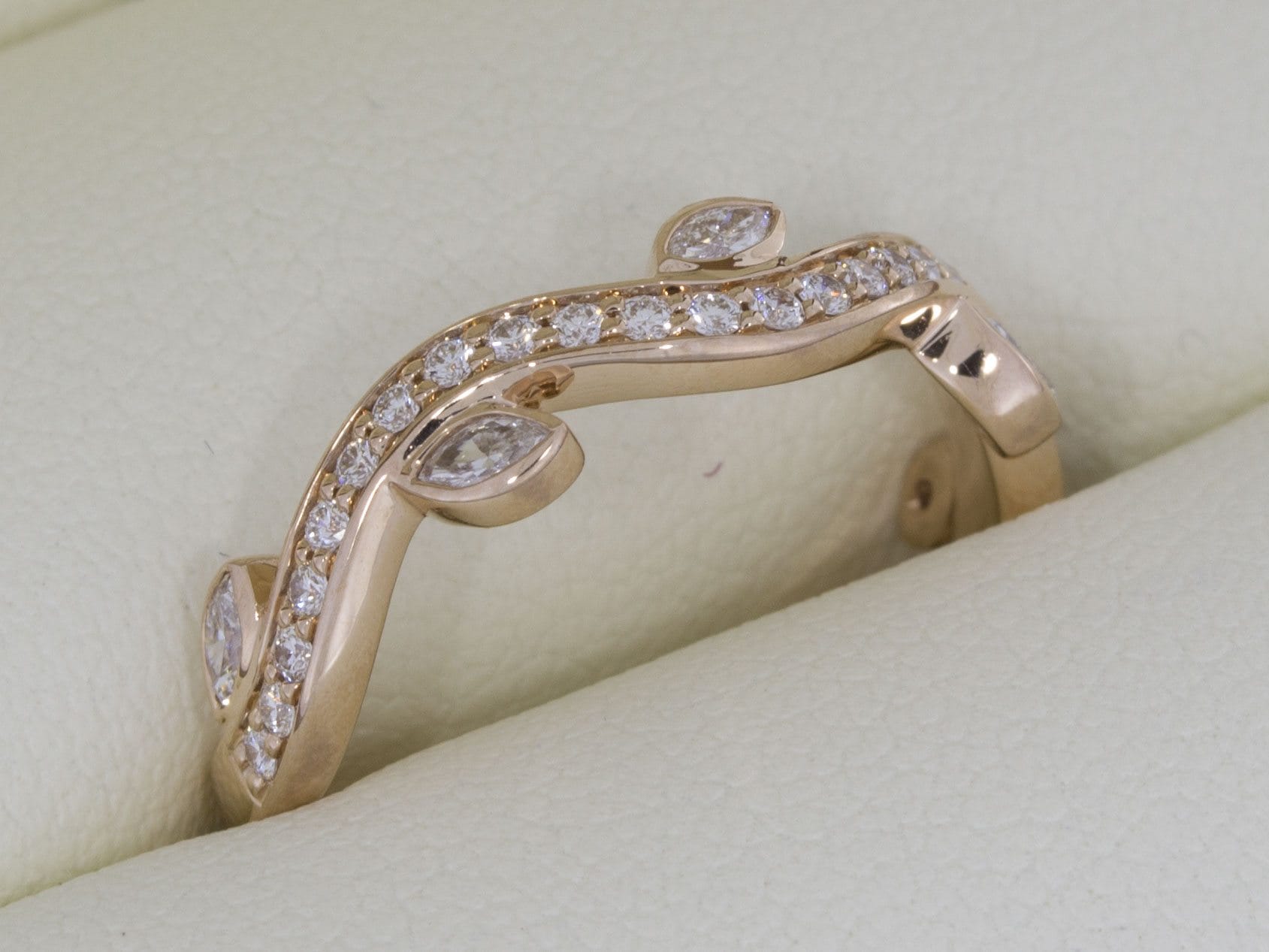 A pretty rose gold wave band with micro prong set diamonds into the band. This stunning design has added marquise cut diamonds set as an organic leaf detail.