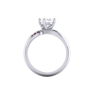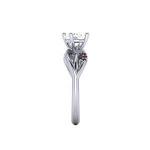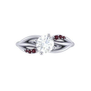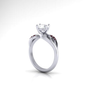 Organic platinum engagement ring with flowing lines which twist around to create the setting for a magnificent brilliant cut diamond. The ring has been set with small red garnets on the shoulders as a sentimental nod to the couple and to add a splash of colour.