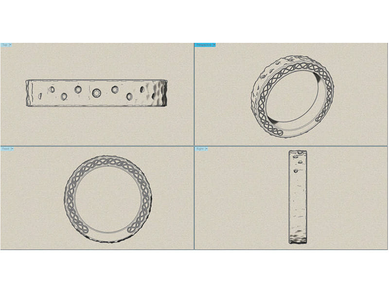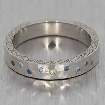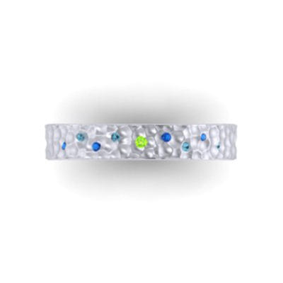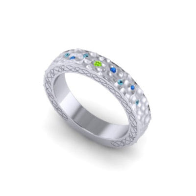 A wide hammered textured palladium band set wonderfully with striking aquamarine and peridot stones finished with unique celtic engraving on the faces