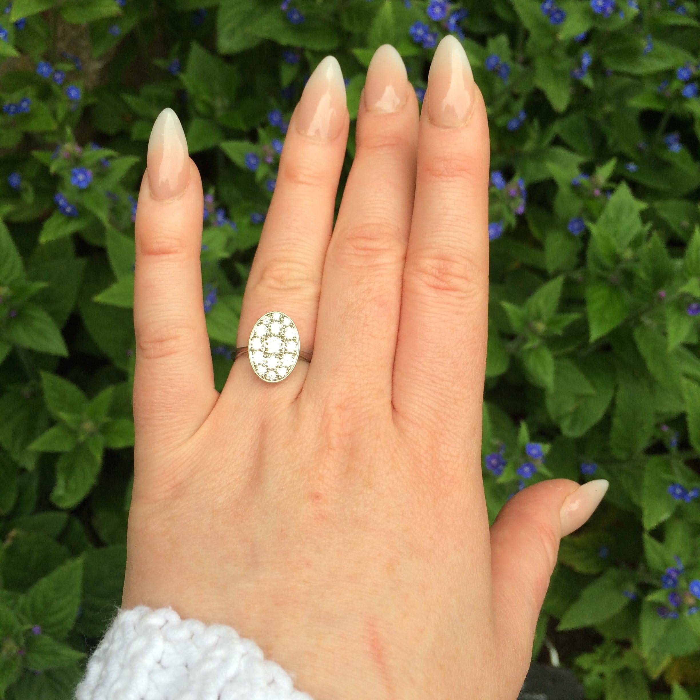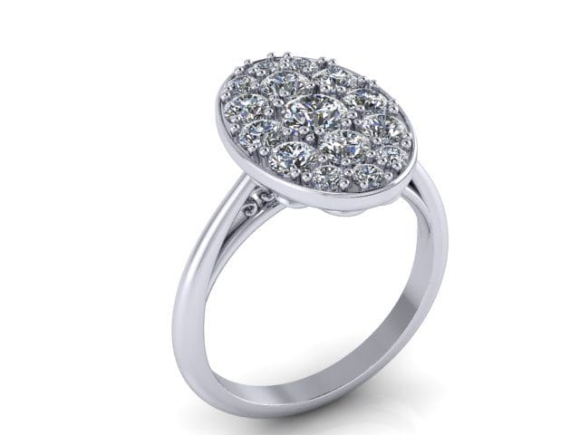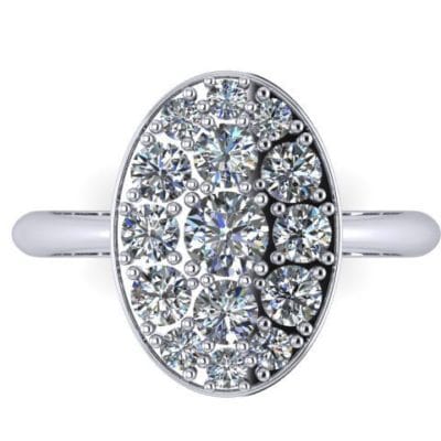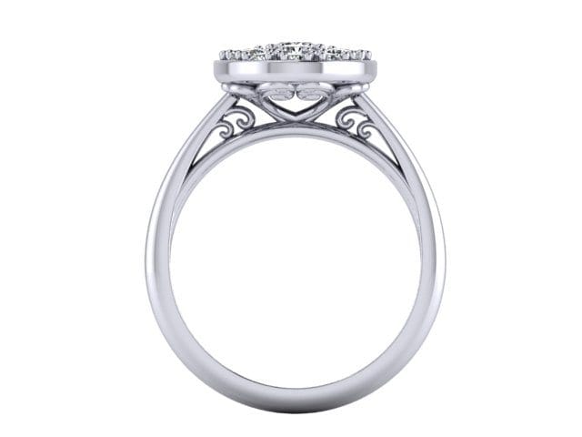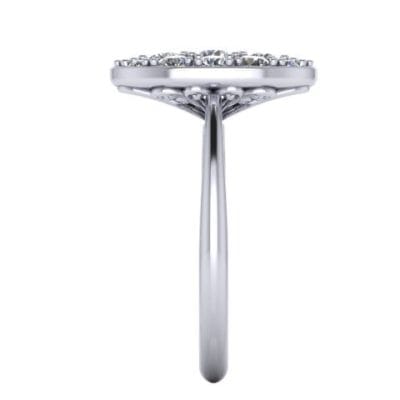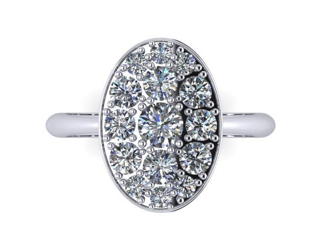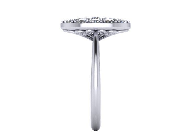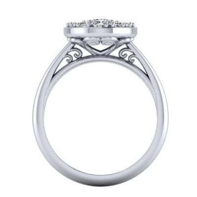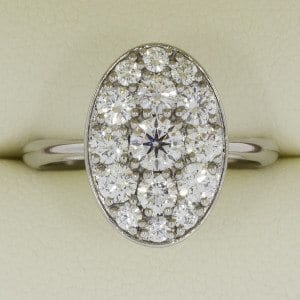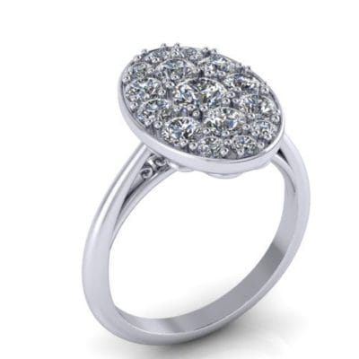 This showstopping design was inspired by the Twilight ring. The central focus is a bed of pave set diamonds on an oval platinum disc that is accentuated by the platinum band. The underside of the ‘bed’ is a beautiful intricate web of filigree wire-work that lifts the simplicity of the band into a more unusual piece without detracting from the collection of diamonds.