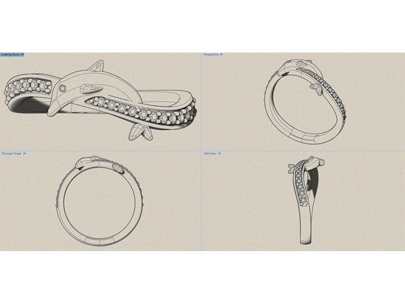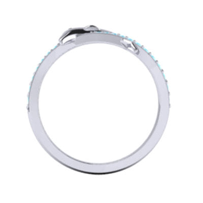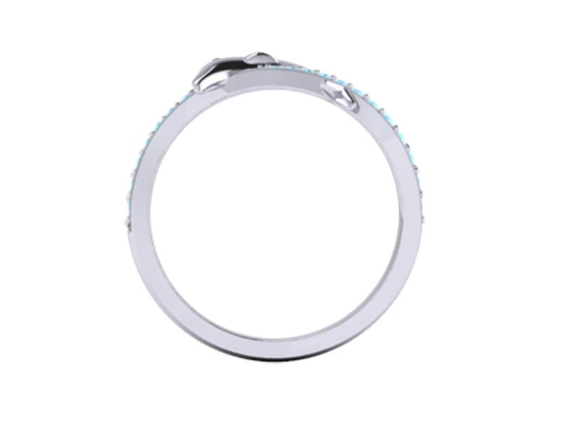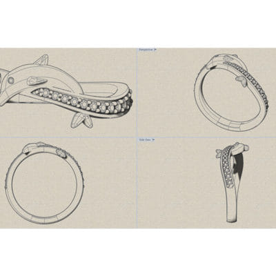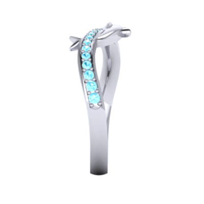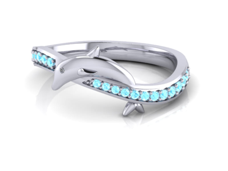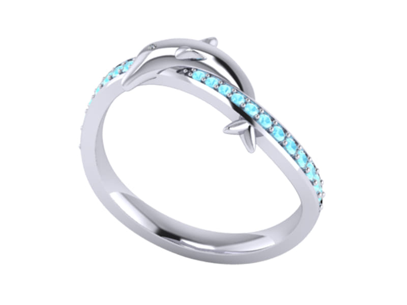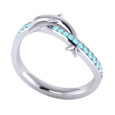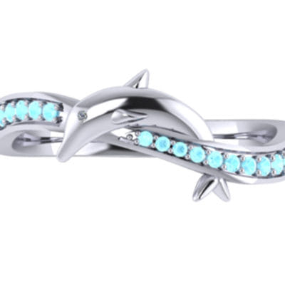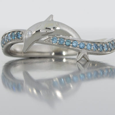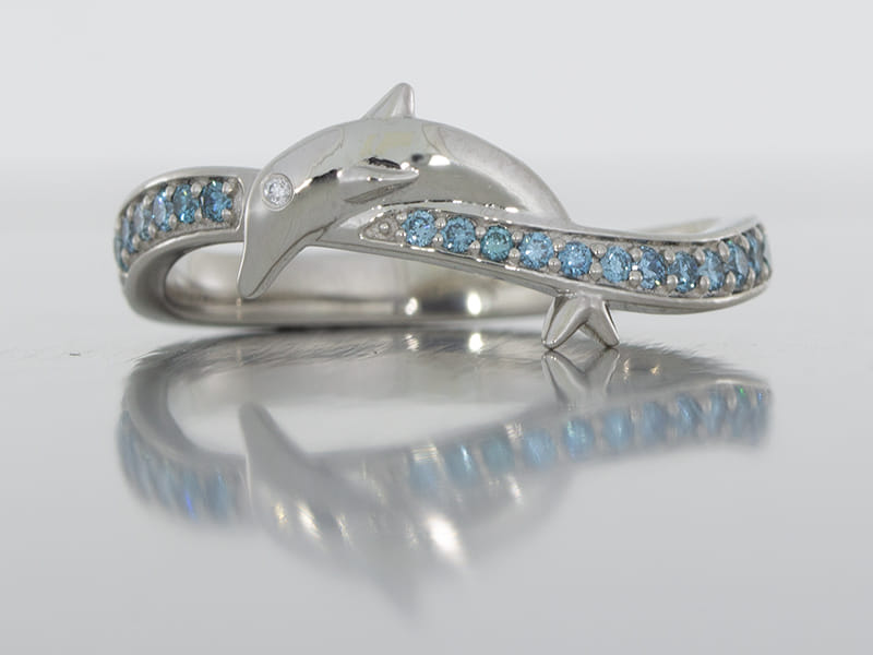 Our client spent a considerable amount of time searching for the perfect ring for his partner. He eventually gave the challenge to Durham Rose and together we created a truly unique ring. The platinum dolphin rides the wave of sparkly blue diamonds to capture the fluidity of the mammal as it jumps through the water.