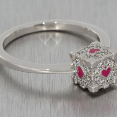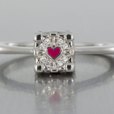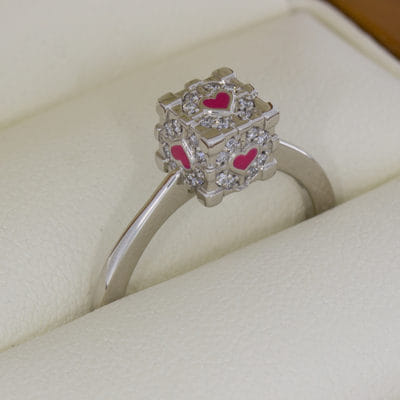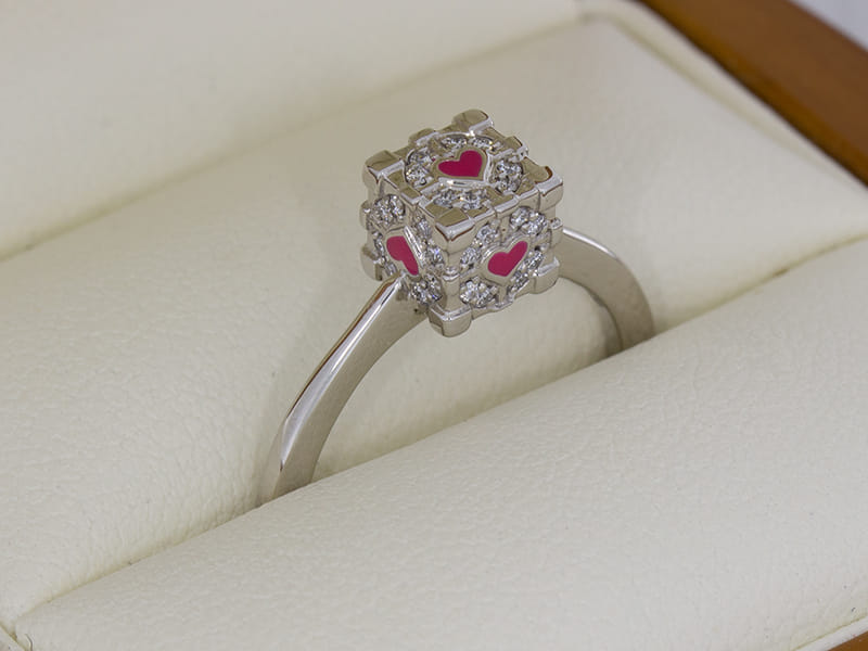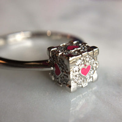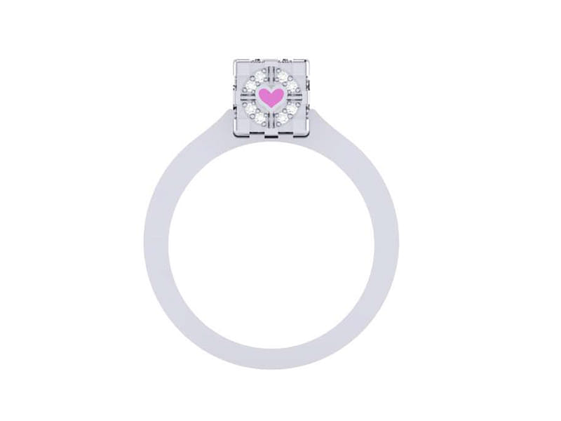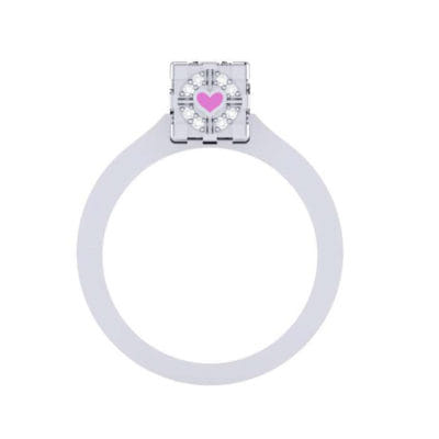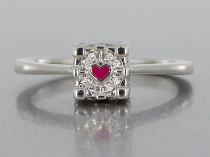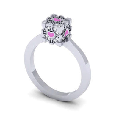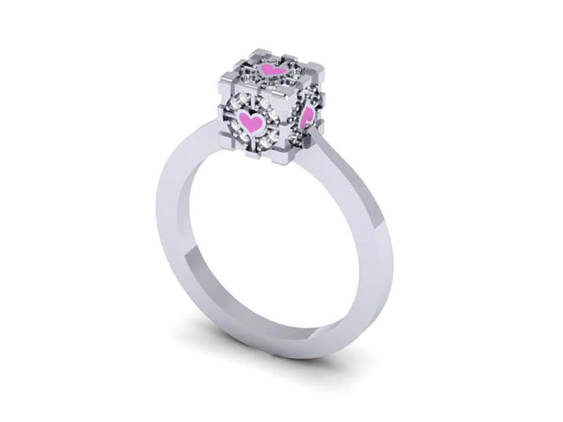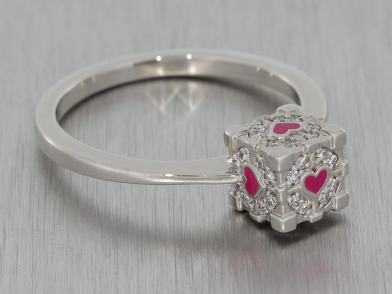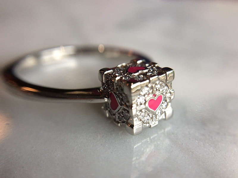 Platinum engagement ring in the style of a Companion Cube, holding huge sentimental value for our lovely customer. The cube features pink resin hearts surrounded by rings of white diamonds.